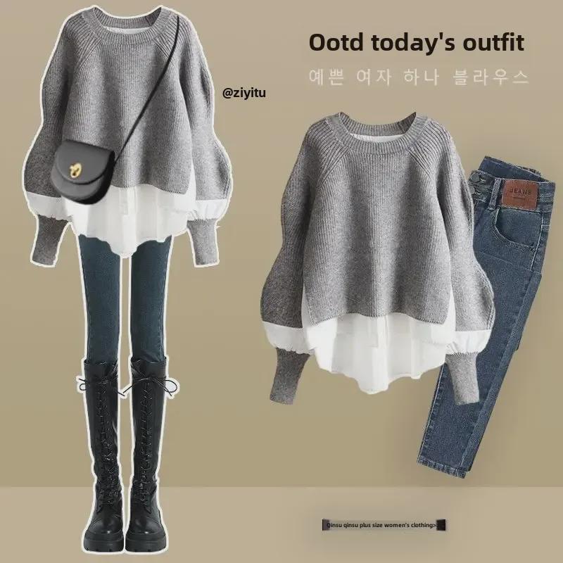 Женский осенний комплект из двух частей больших размеров 2024 года: Элегантный топ-рубашка и узкие джинсы — купить товар онлайн с бесплатной доставкой до всему миру!