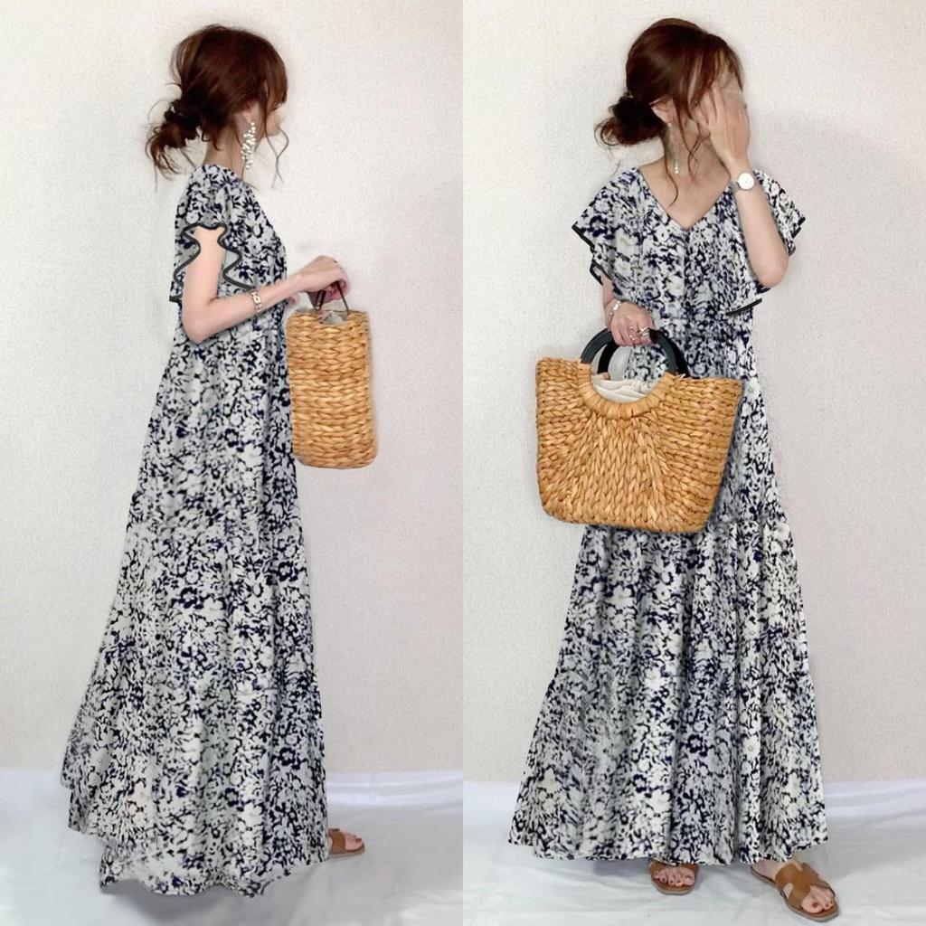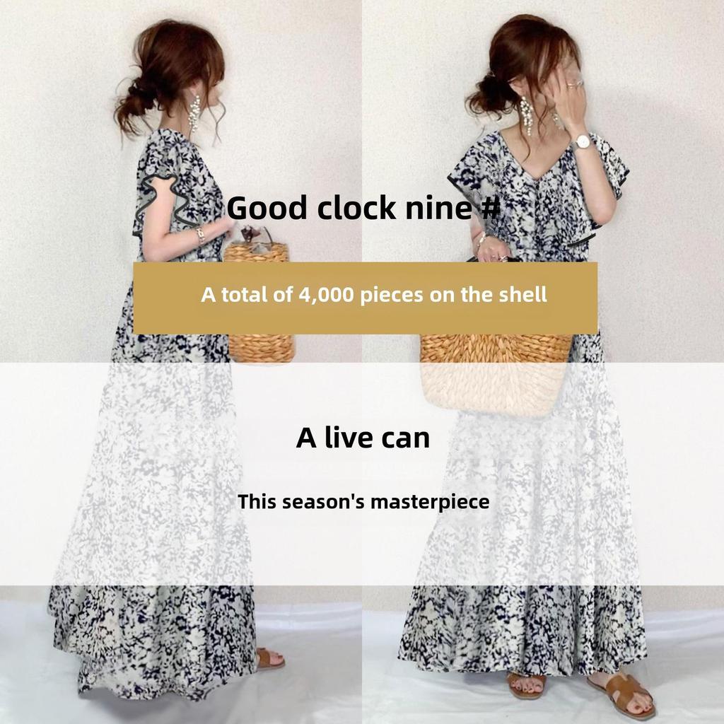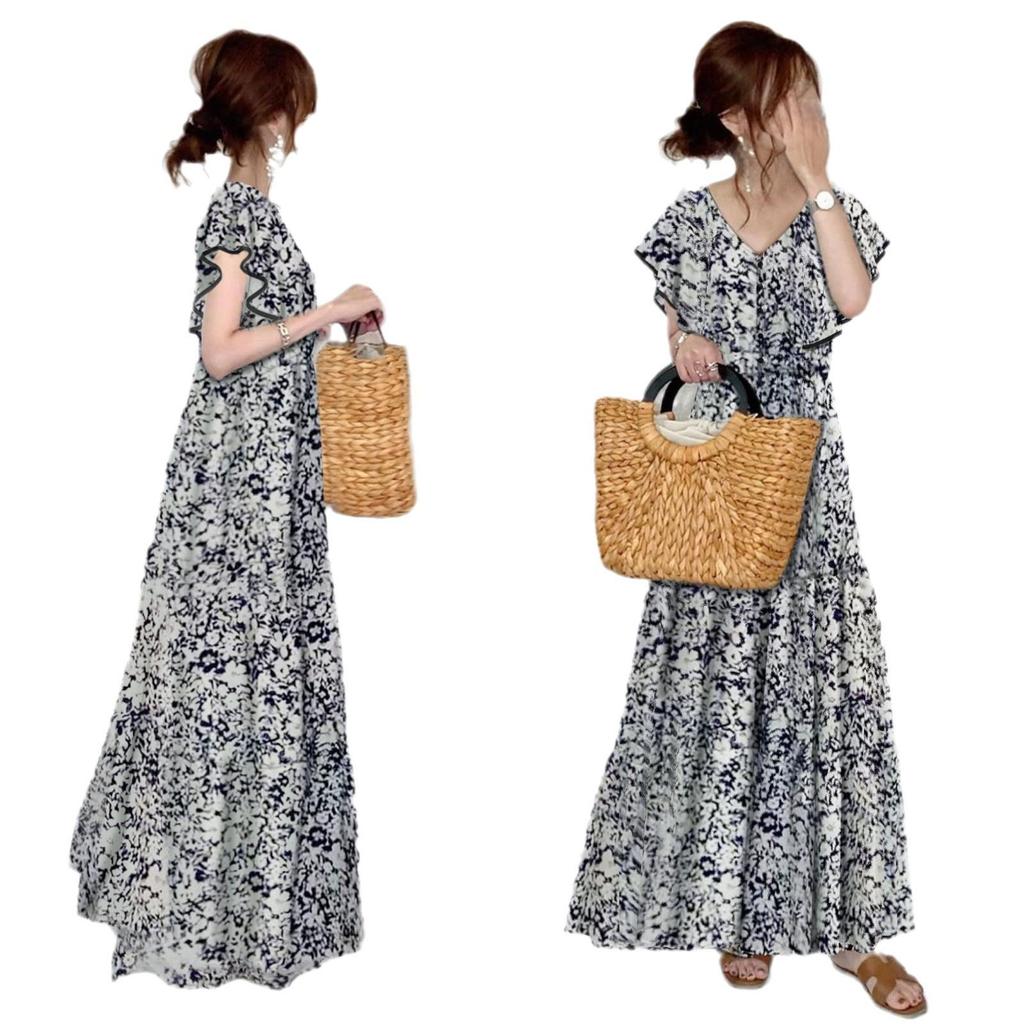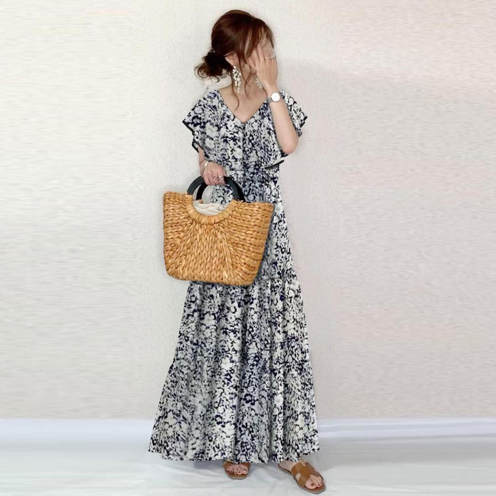 Летнее платье 2024 года с цветочным принтом, V-образным вырезом, длинными рукавами и трапециевидной формой