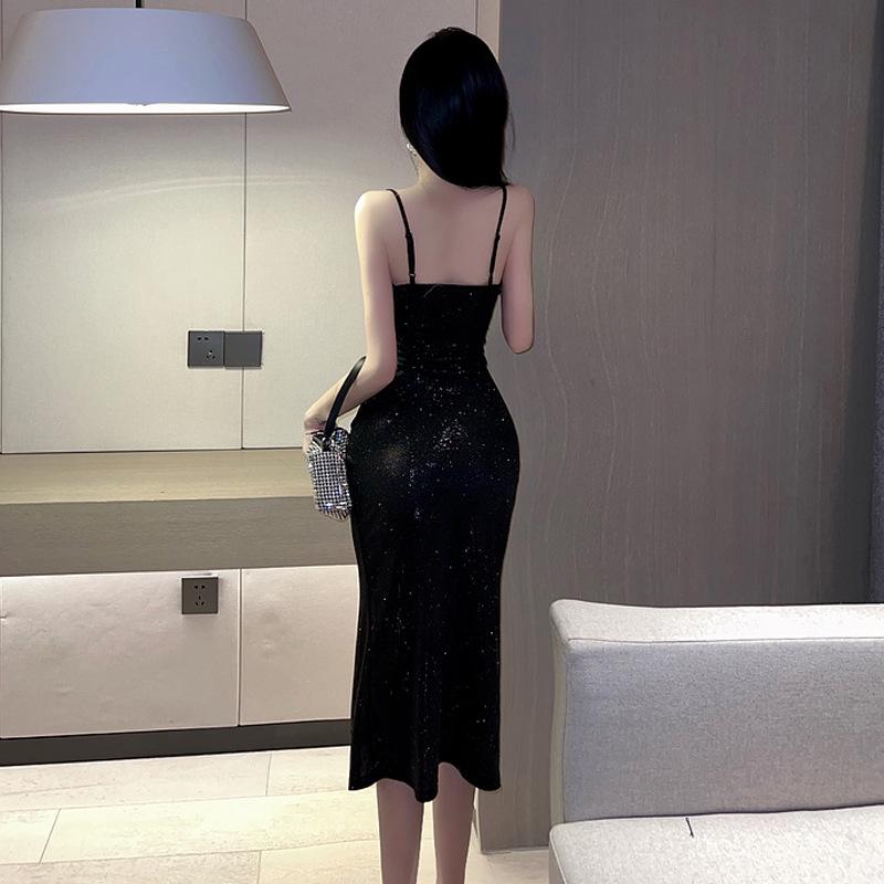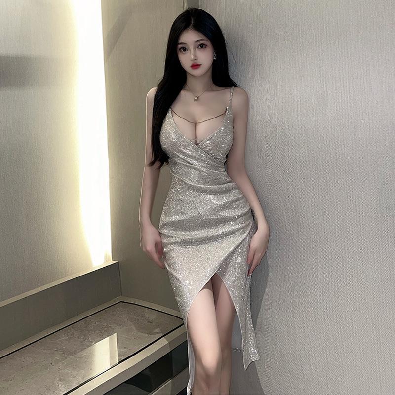 2023 Европейско-американское блестящее шелковое платье миди с V-образным вырезом и разрезом