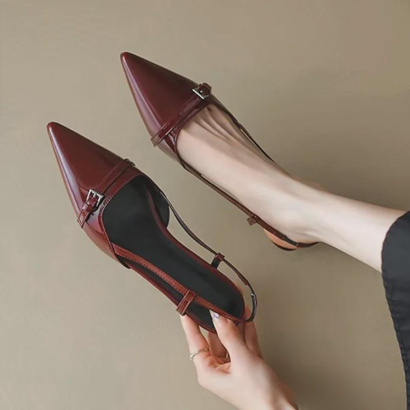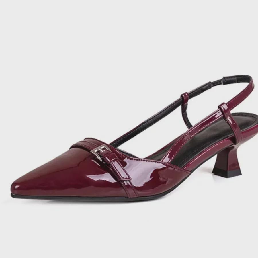 «Женские туфли-лодочки в стиле ретро из лакированной кожи с острым носком, однорядной пряжкой и полой задней частью для лета»
