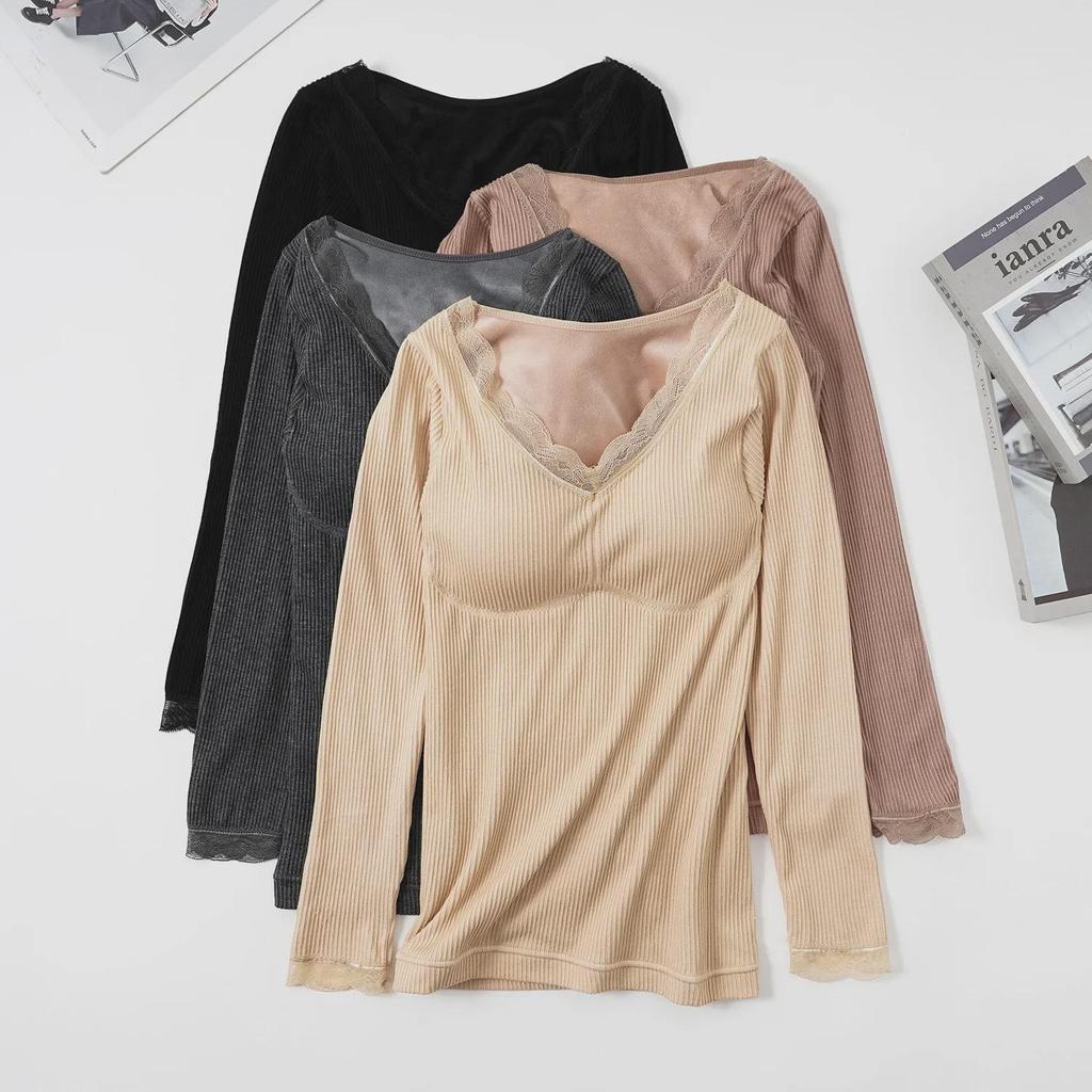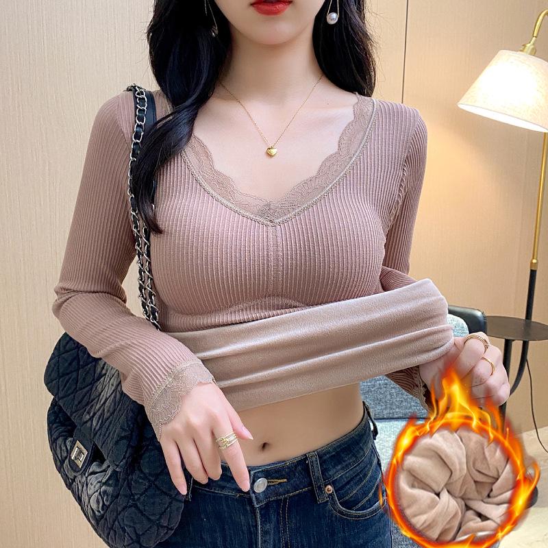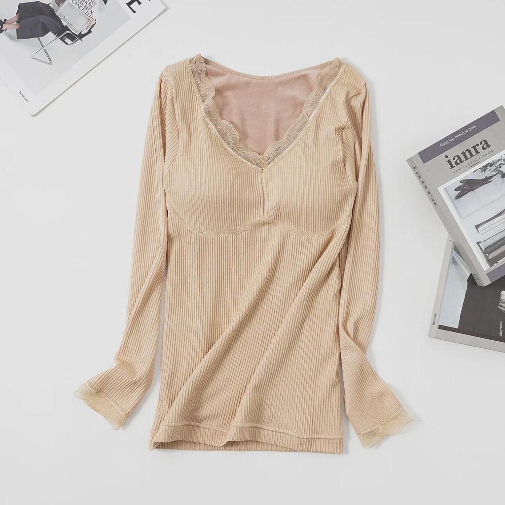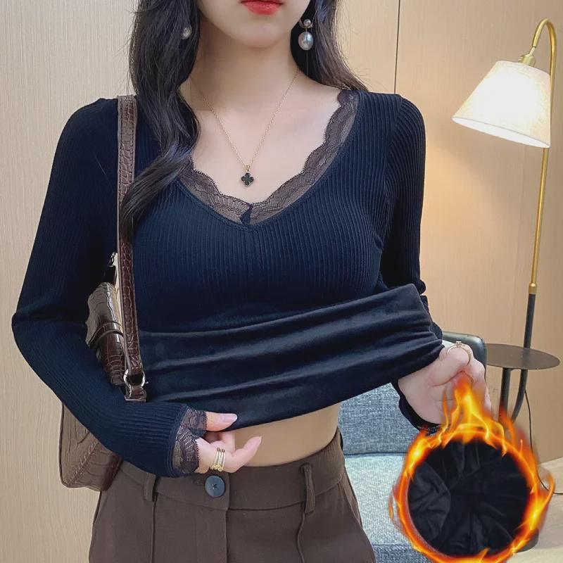 «Теплый женский зимний флисовый топ с V-образным вырезом, нагрудными накладками, длинным рукавом, облегающей низом»