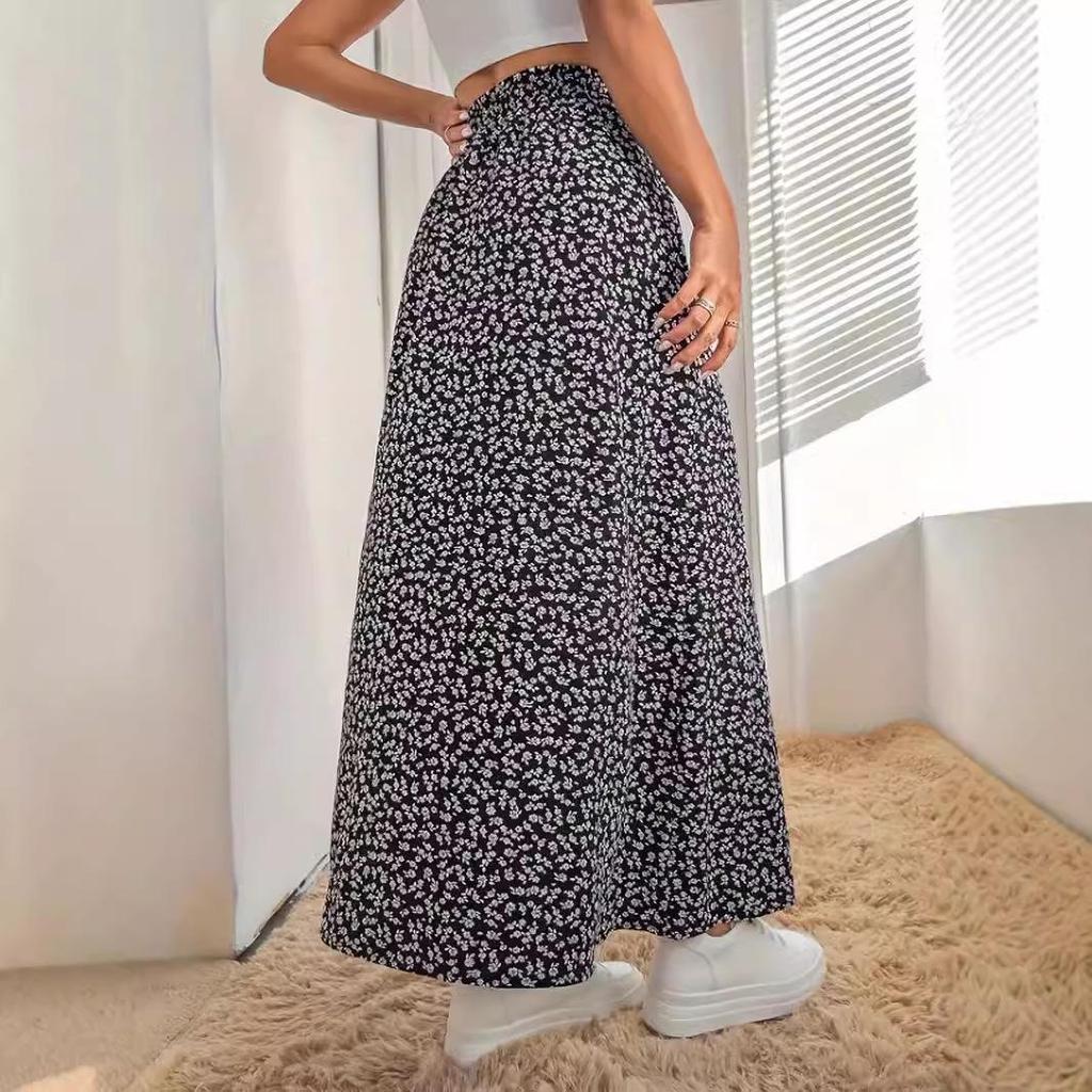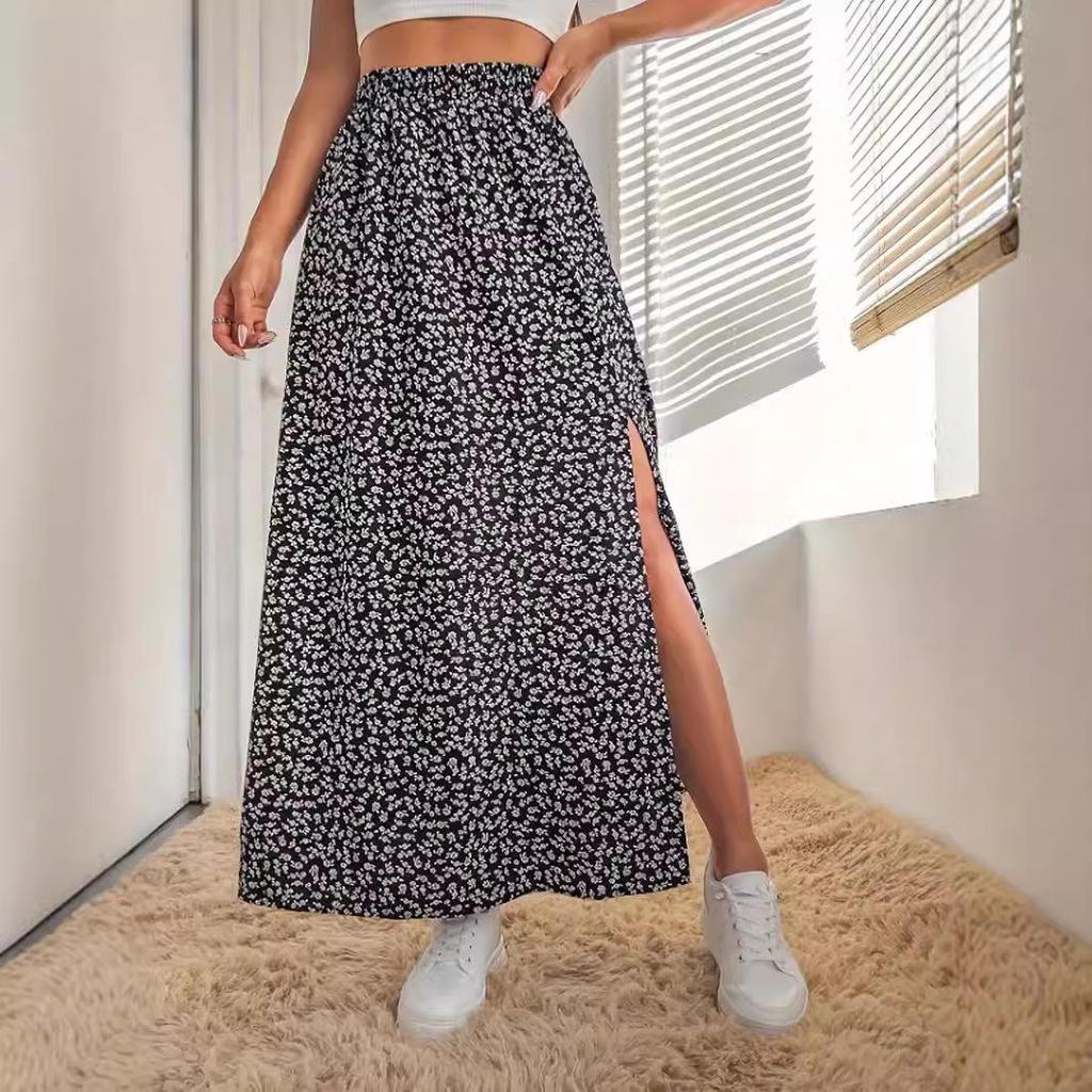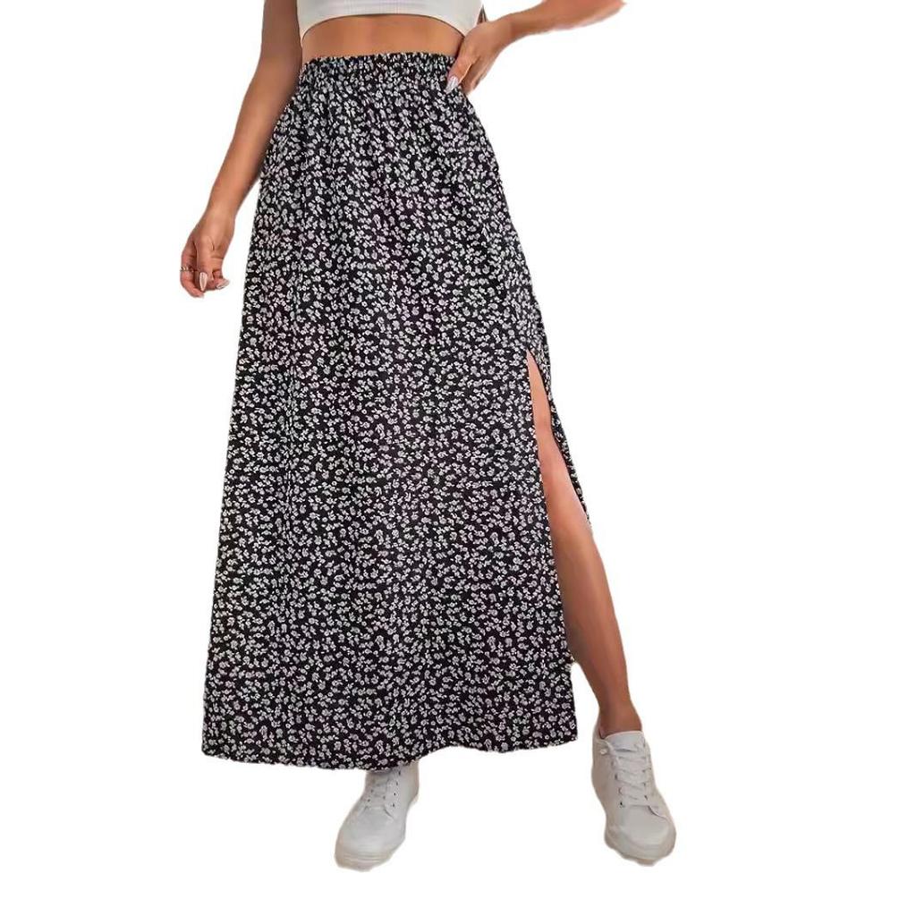Повседневная юбка А-силуэта средней длины с европейским и американским цветочным принтом и разрезом