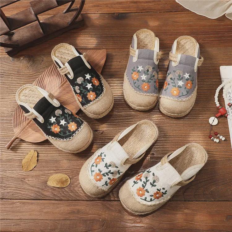 2025 Вышитые балетки: Весна, лето, осень Женская повседневная обувь из льна в национальном стиле