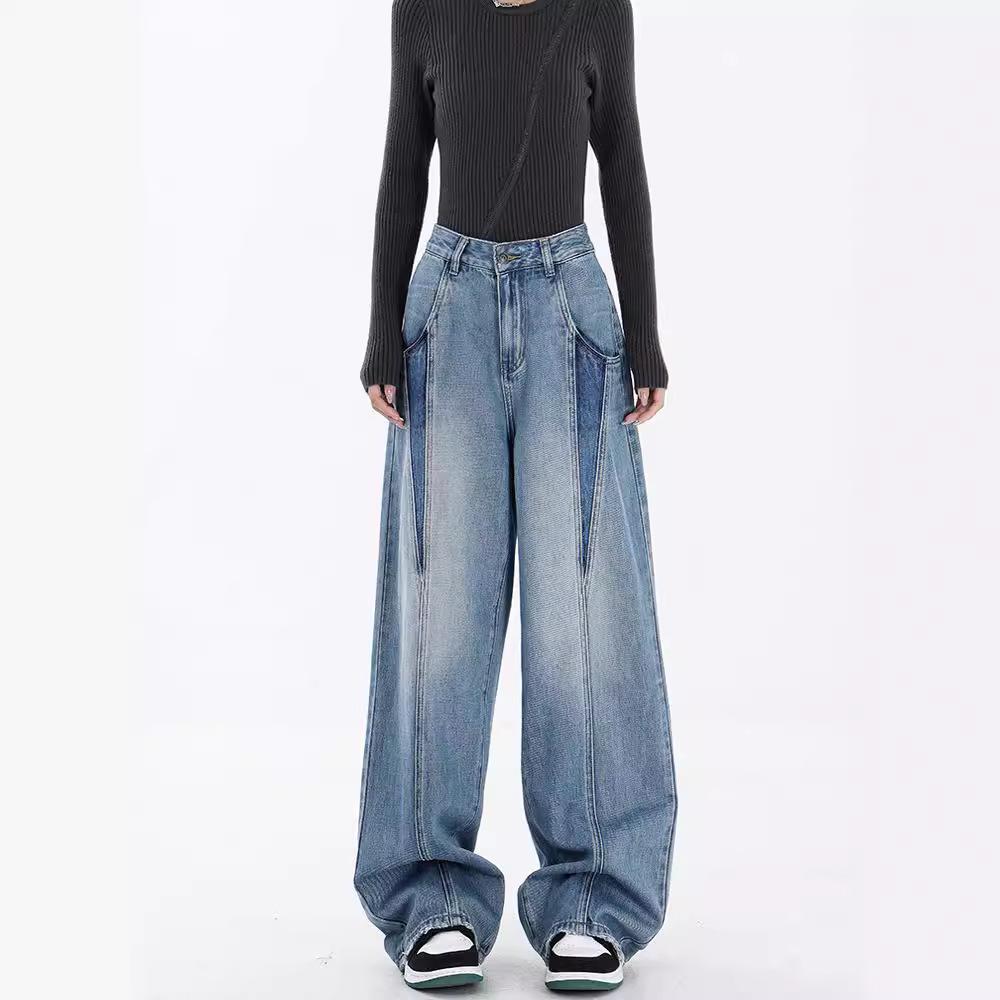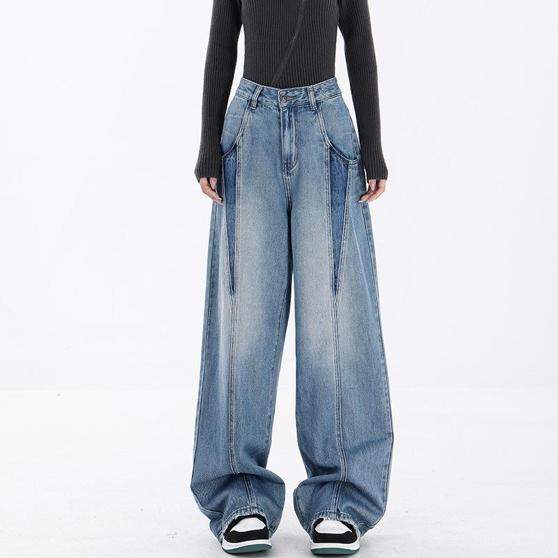 Женские свободные джинсы большого размера в стиле ретро: Контрастная отделка, прямой крой, длина до пола, идеально подходит для весны и осени.