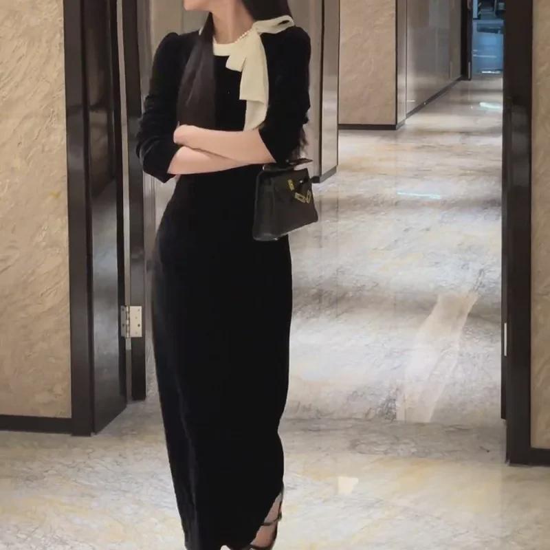 Платье из бархата с французским бантом в стиле Хепберн — длинная юбка на осень/зиму