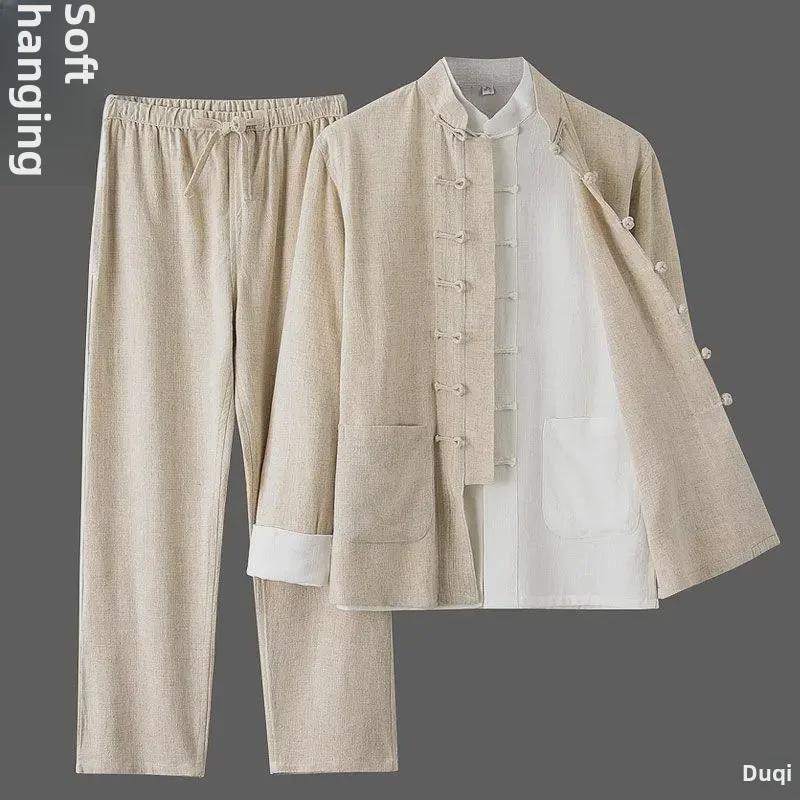 Костюм Тан Весна-Лето: Хлопково-льняной костюм-тройка в китайском стиле с воротником-стойкой на пуговицах