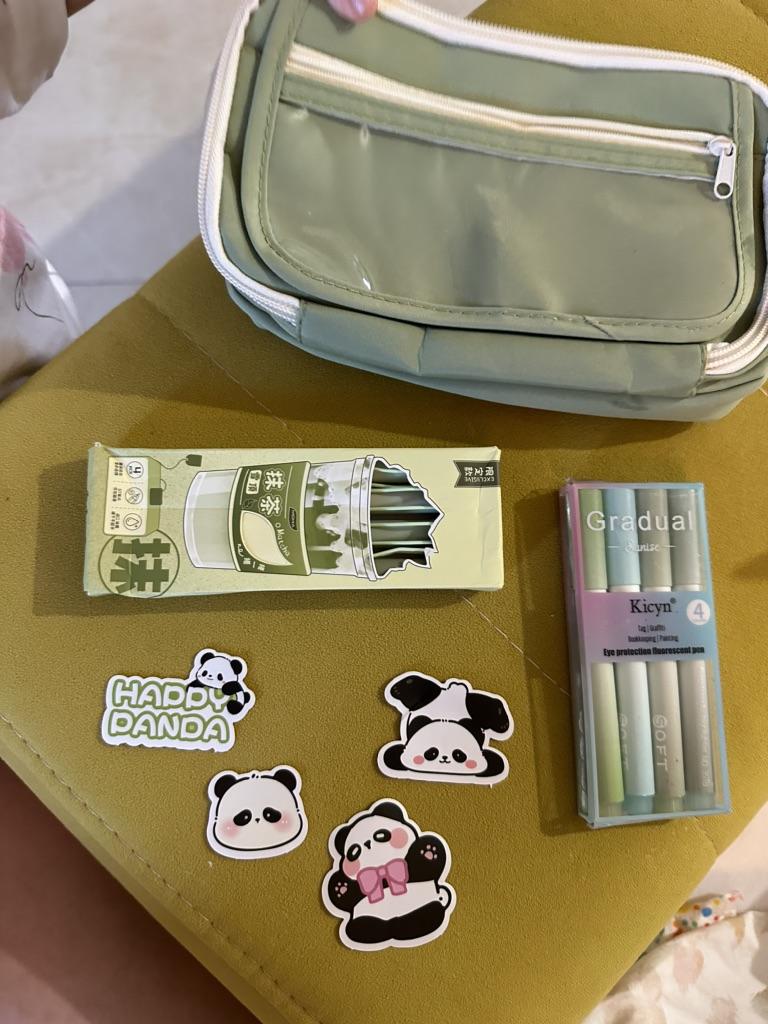 Пришел по времени. Упакован хорошо. Чистый, без запаха. Все ручки герметично закрыты, не текут. Маркеры пишут. Наклейки тоже есть. Но минус «звезда», потому что не положили брелок с пандой.