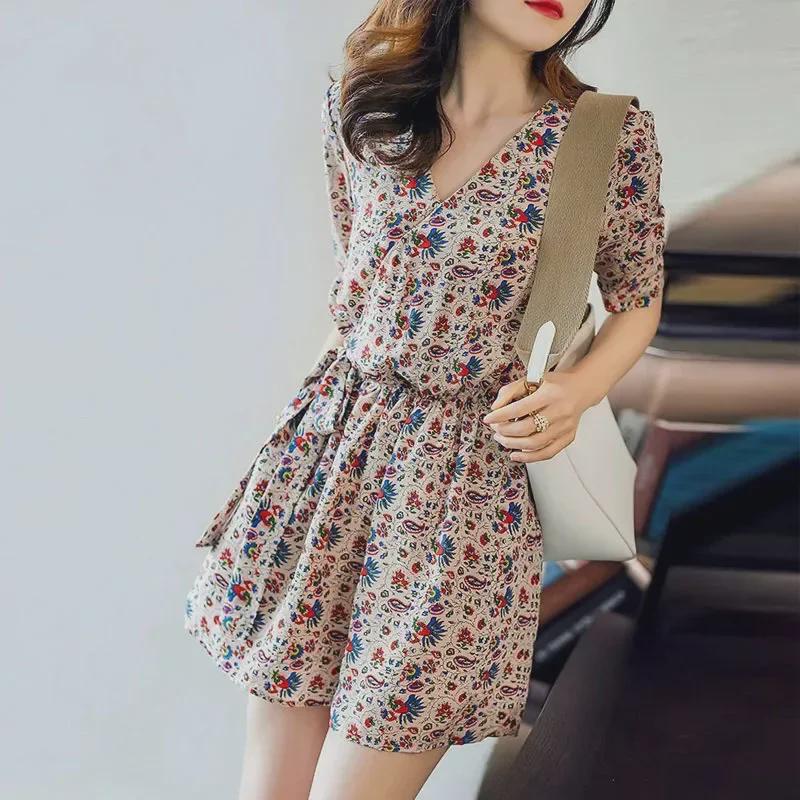 2024 Летний шифоновый комбинезон с широкими штанинами и цветочным принтом для женщин