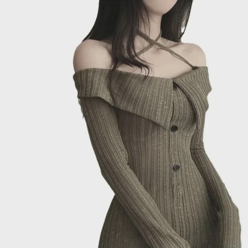 Корейский шик осеннее платье на одно плечо с перекрестной бретелькой через шею облегающего кроя с длинными рукавами для женщин