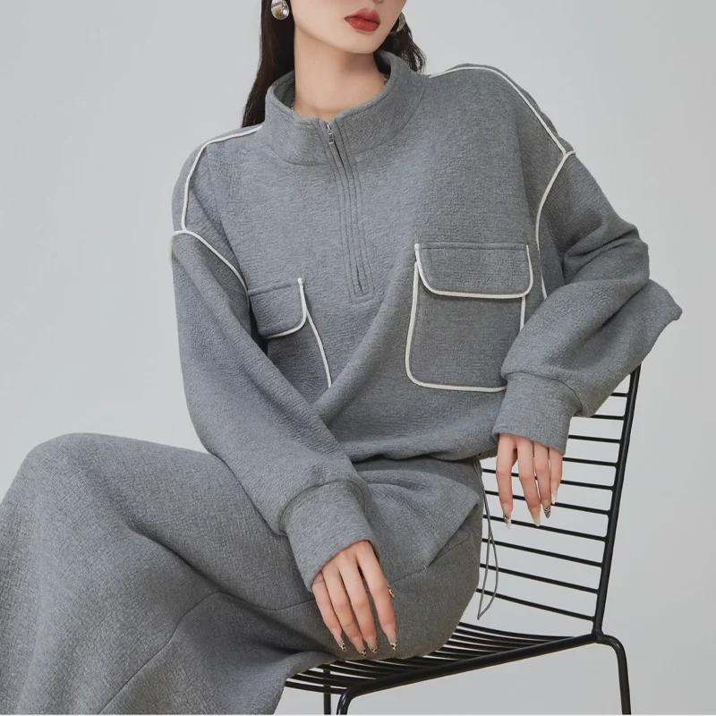 Женский высококачественный серый свитер с юбкой и воротником-стойкой, спортивный комплект из двух предметов - коллекция осень/зима 2024 г.
