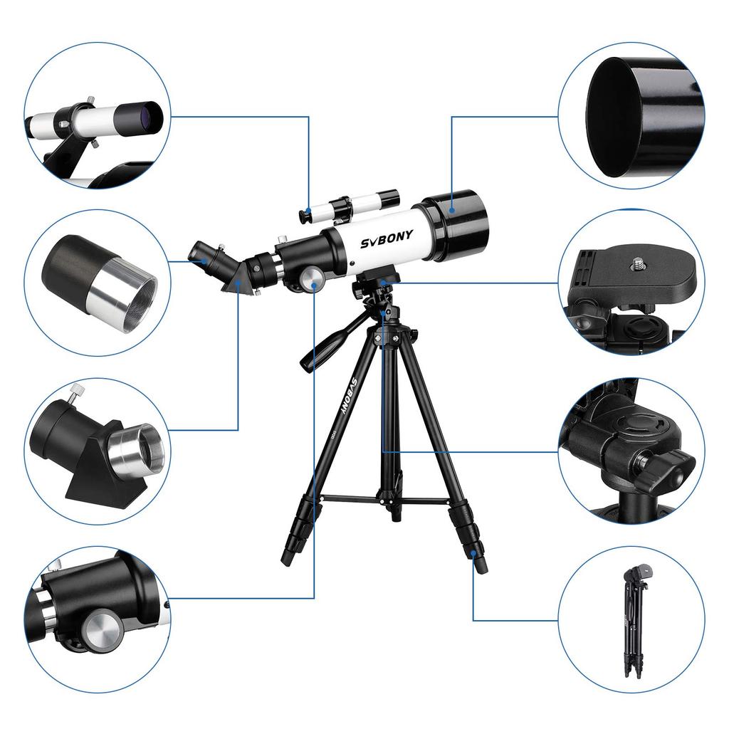 1. Большой объектив 70 мм: Оптический путь прост, контрастность хорошая, и по всему полю зрения формируется спокойное, четкое изображение. ・Обслуживание простое, и даже новички не почувствуют никакого дискомфорта.. Высококачественные линзы FMC защищают глаза детей 2. Регулируемый штатив: Трехступенчатый штатив удобен для использования в различных положениях наблюдения от 410 мм до 1050 мм.. 3. Зенитное зеркало 90°: Оснащен 1,25-дюймовым зенитным зеркалом с углом обзора 90°, позволяющим получать прямое изображение.. Наземные пейзажи и небесные наблюдения также могут обеспечить яркие изображения.. 4. Подарок для новичков, студентов и детей: Телескоп, предназначенный для взрослых новичков и детей.. Телескоп SV501 70 мм подходит как для наземных, так и для небесных наблюдений, обеспечивая яркие и детальные изображения.. Прост в эксплуатации, удобен в переноске и может использоваться начинающими астрономами.