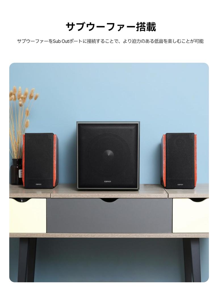 [Активная акустическая система со встроенным выходным усилителем] Выходной разъем сабвуфера позволяет подключать внешний сабвуфер.. Благодаря двум входам RCA для подключения смартфона, телевизора, DVD и компьютера вы можете подключить два устройства одновременно, без необходимости использования розетки.