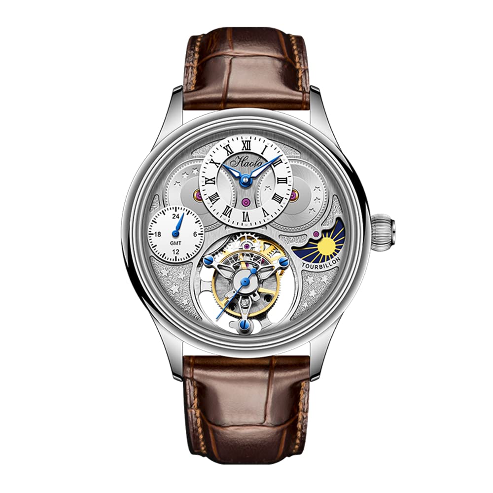 Часы HAOFA Tourbillon с механическим ручным заводом, функцией GMT, фазой Луны, полым циферблатом, роскошным стильным сапфировым стеклом, популярным водонепроницаемым подарком для мужчин и женщин