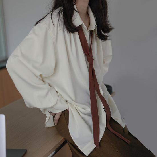 Шикарный дизайн лацкана: Дополните свой образ однотонной рубашкой с длинными рукавами и лацканами, украшенной завязкой, которая добавит вашему наряду нотку элегантности и очарования.