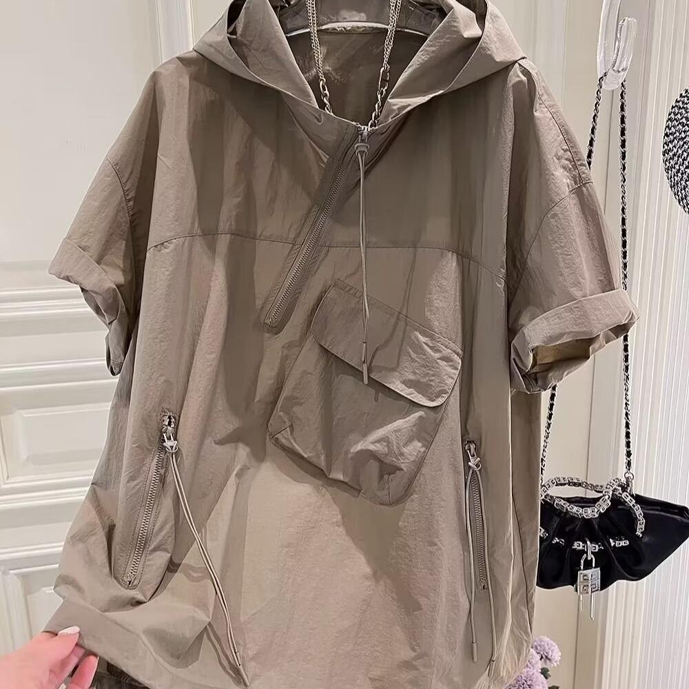 Мужская однотонная уличная толстовка с капюшоном на молнии с декоративным клапаном и карманом, свободный крой, короткие рукава, однотонная — купить товар онлайн с бесплатной доставкой по всему миру!