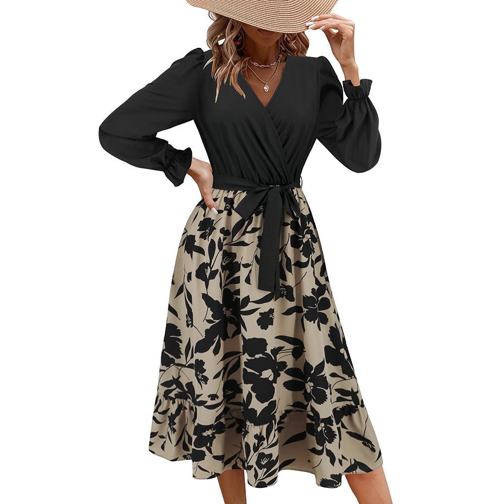 Весенне-осеннее женское платье трапециевидной формы с v-образным вырезом и длинным рукавом с принтом