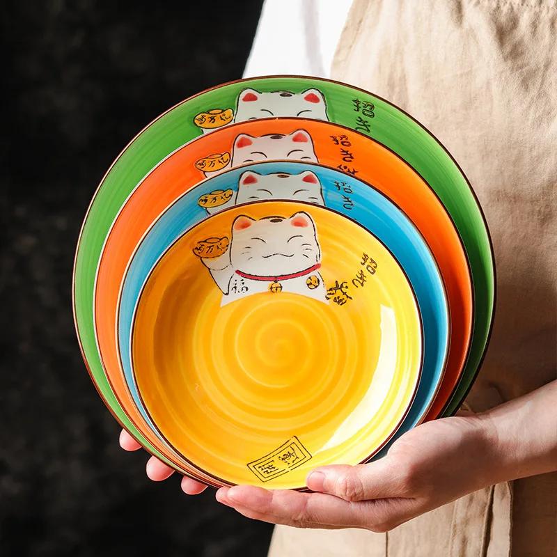 Мультяшная тарелка из керамики 'Счастливый кот' круглая, разных размеров, японская, креативная, разноцветная, кухонная, для дома, ручной работы, мультяшная обеденная тарелка — купить товар онлайн с бесплатной доставкой по всему миру!
