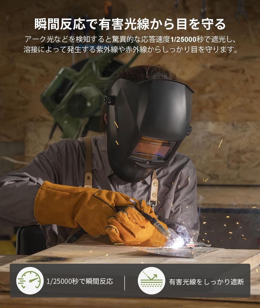 [Надежно защитите свои глаза с мгновенным реагированием] При обнаружении дугового света и т. п. он автоматически блокирует свет с удивительной скоростью реагирования 1/25000 секунды.. Он эффективно блокирует не только ослепляющий свет, создаваемый при сварке, но и невидимые вредные лучи, такие как инфракрасные и ультрафиолетовые лучи.. Кроме того, в отличие от традиционных ручных моделей, вы можете свободно использовать обе руки, что облегчает работу.