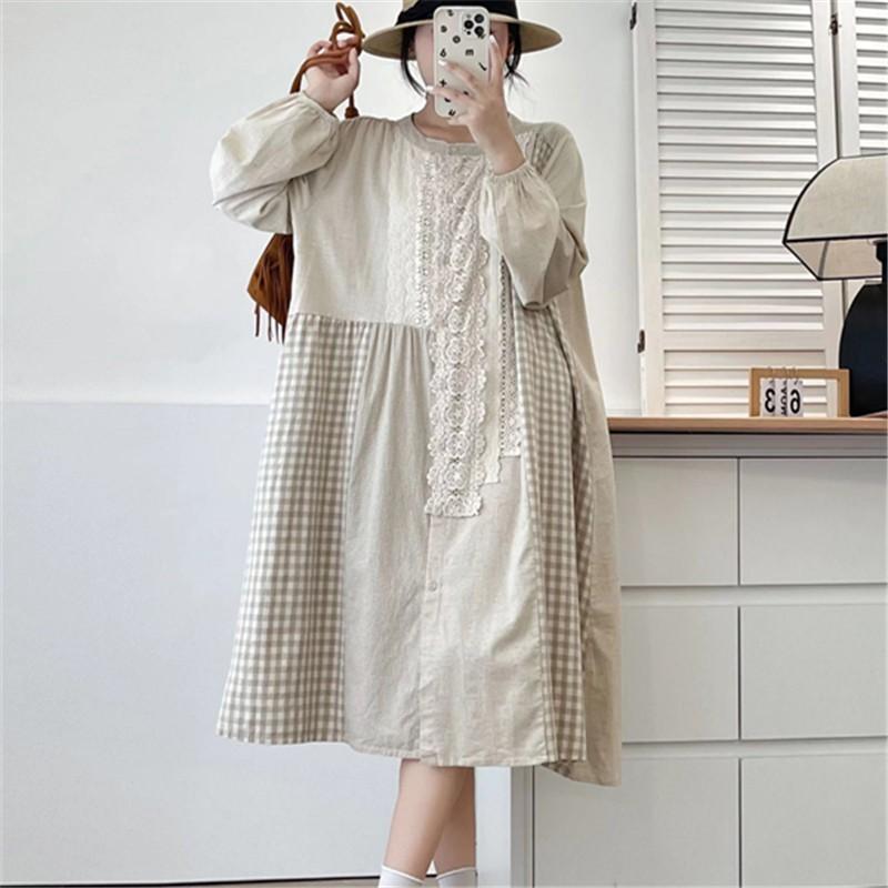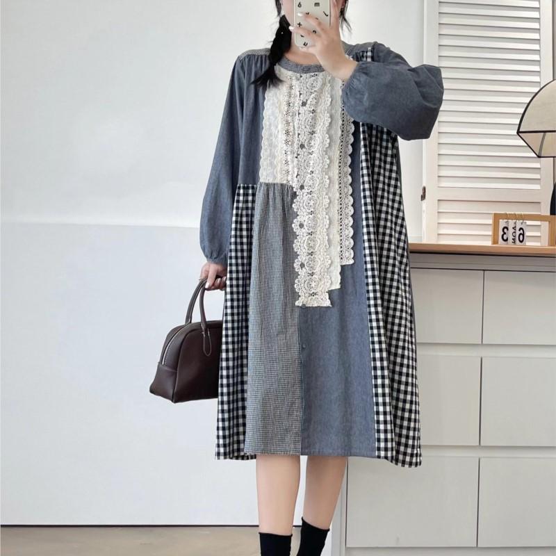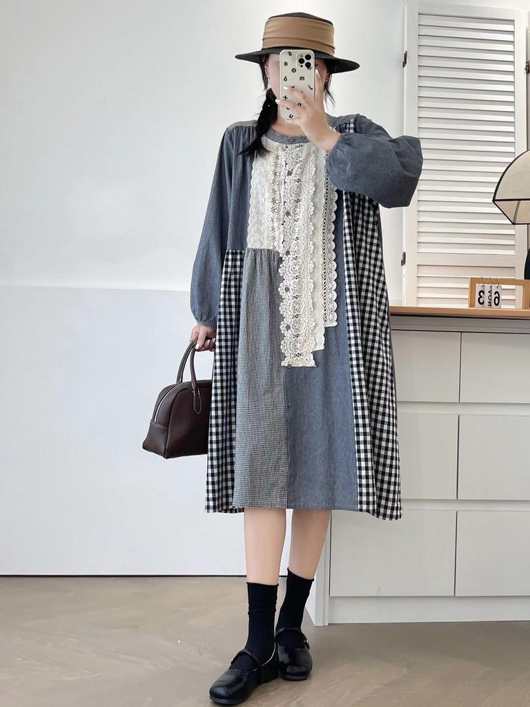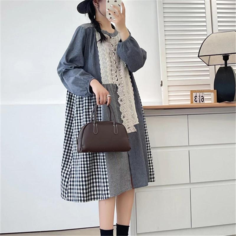 Johnature Весеннее лоскутное кружевное клетчатое платье Весеннее ретро повседневное свободное женское платье с длинным рукавом