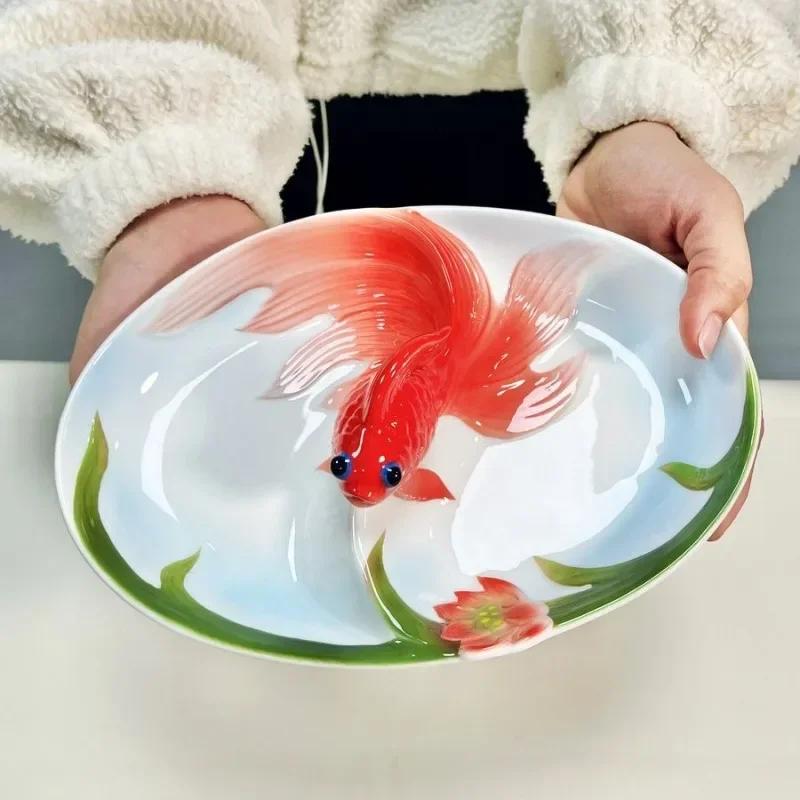 Керамическая разделительная миска с изображением кои, покрытая подглазурной глазурью, с двойной решеткой, тарелка для закусок, сухофруктов, миска для гарниров для дома
