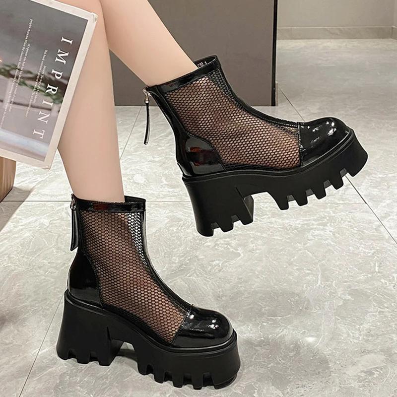Черные женские ботильоны на платформе в готическом стиле с толстой подошвой, дышащие летние ботинки, женские ботинки в стиле панк на массивном высоком каблуке