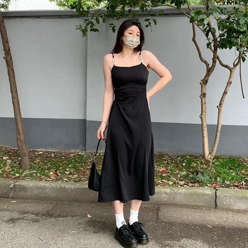 Черное платье на подтяжках с темпераментом, узкая черная юбка, летняя юбка А-силуэта средней длины в стиле Хепберн в корейском стиле