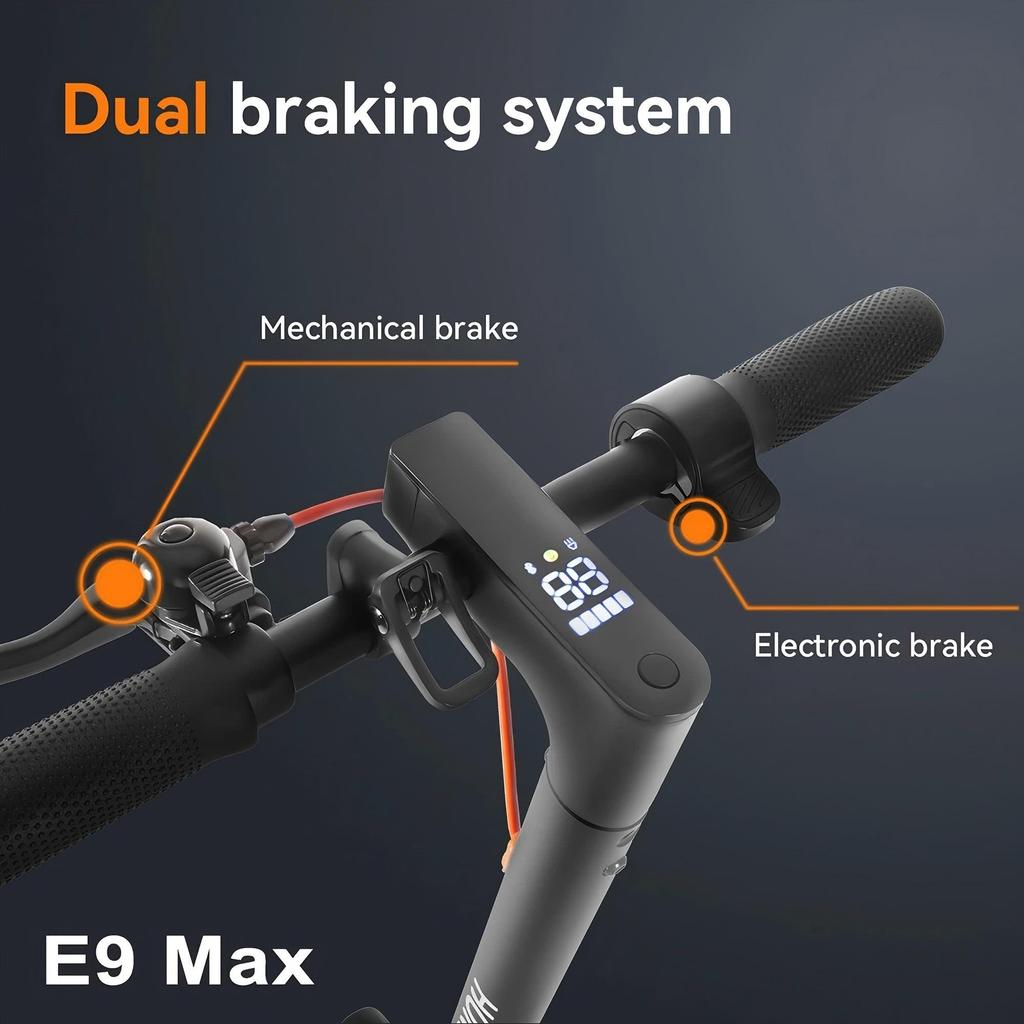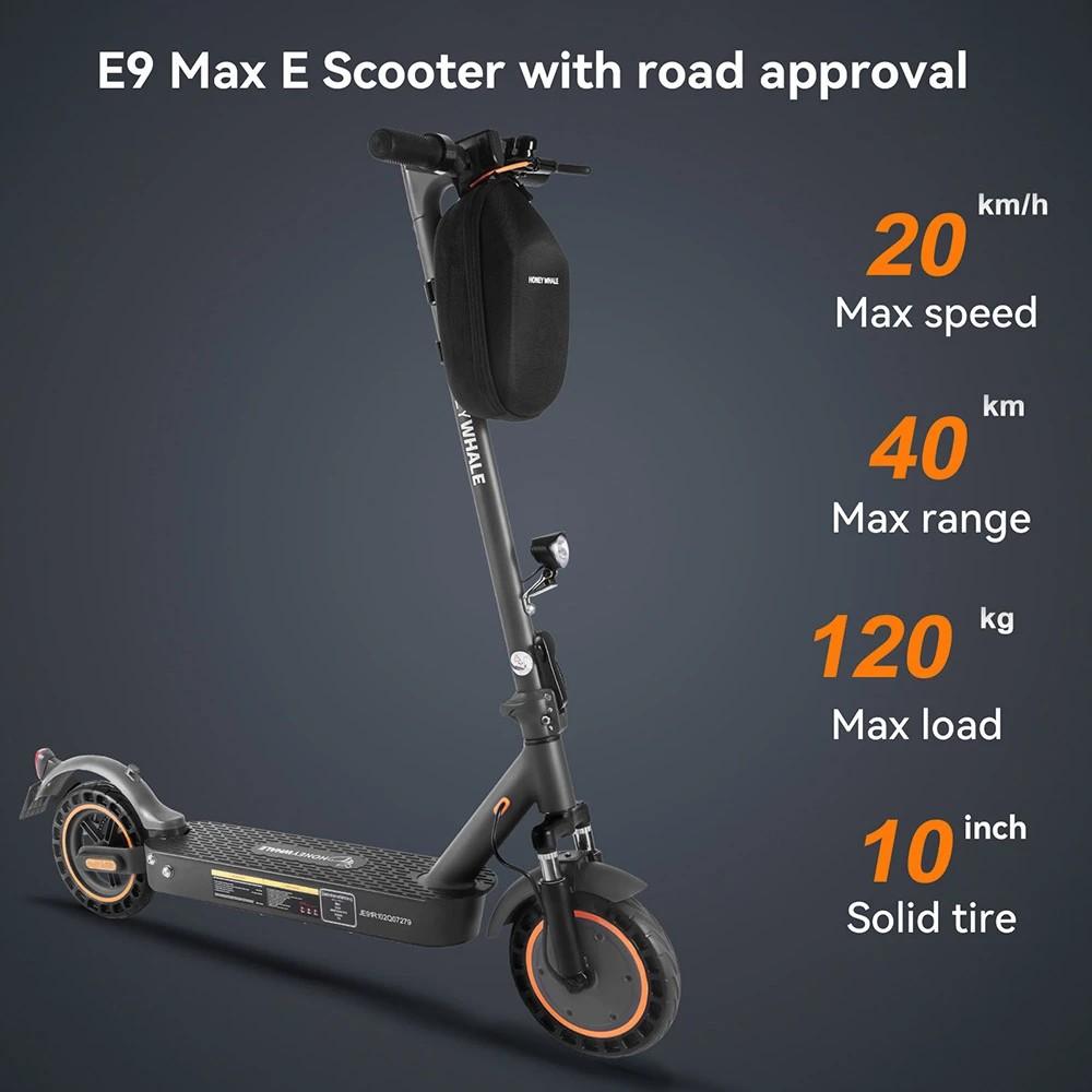 HONEYWHALE E9 MAX оснащен мощным двигателем 500 Вт и высоковольтной батареей 36 В 10 Ач, максимальная скорость может достигать 20 км/ч, запас хода может достигать 35-40 км, от оживленных улиц до тихих пригородных троп, независимо от времени и места, он может легко доставить вас к месту назначения, чтобы вы могли наслаждаться удовольствием от вождения в каждой поездке.