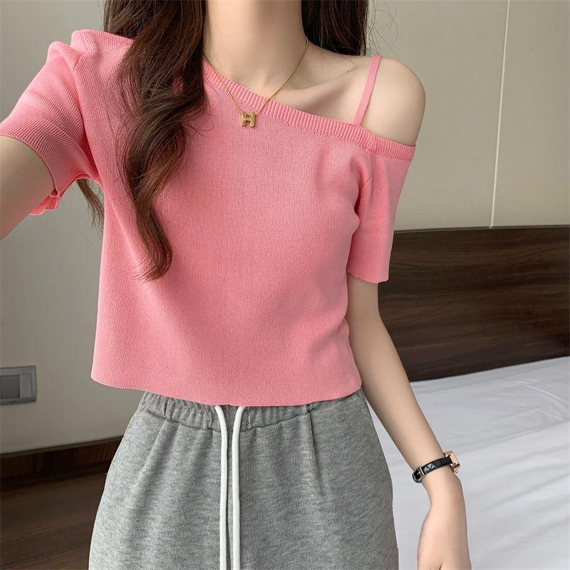 Футболка High End Chic and Beautiful с косым воротником и открытым плечом, короткий трикотажный топ, летняя футболка Ice Silk с короткими рукавами — купить товар онлайн с бесплатной доставкой по всему миру!
