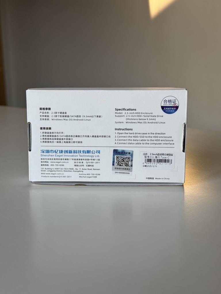 Внешний корпус для жестких дисков EAGET 2.5 дюйма. Поддерживает 2.5-дюймовые жесткие диски (HDD) и твердотельные накопители (SSD). Интерфейс USB 3.0 обеспечивает скорость передачи данных до 5 Гбит/с. Отличается простой установкой без использования инструментов. Доставка около месяца. Трек-номер отслеживался. К покупке рекомендую 👍