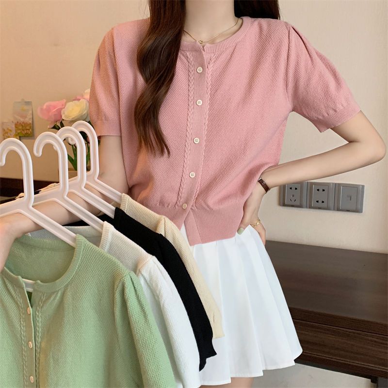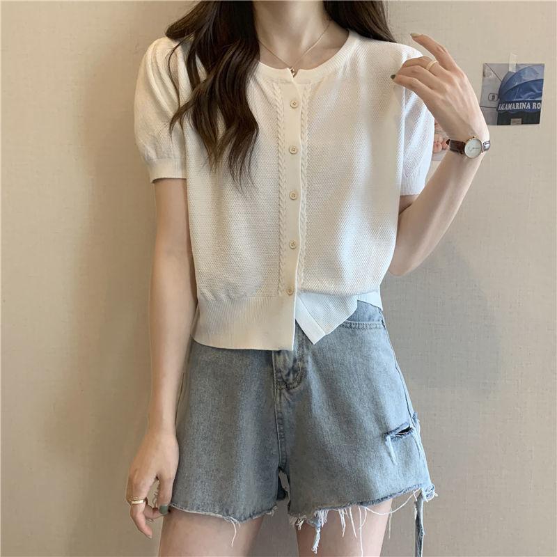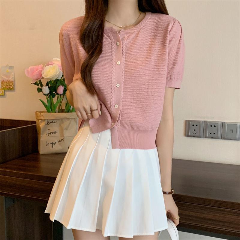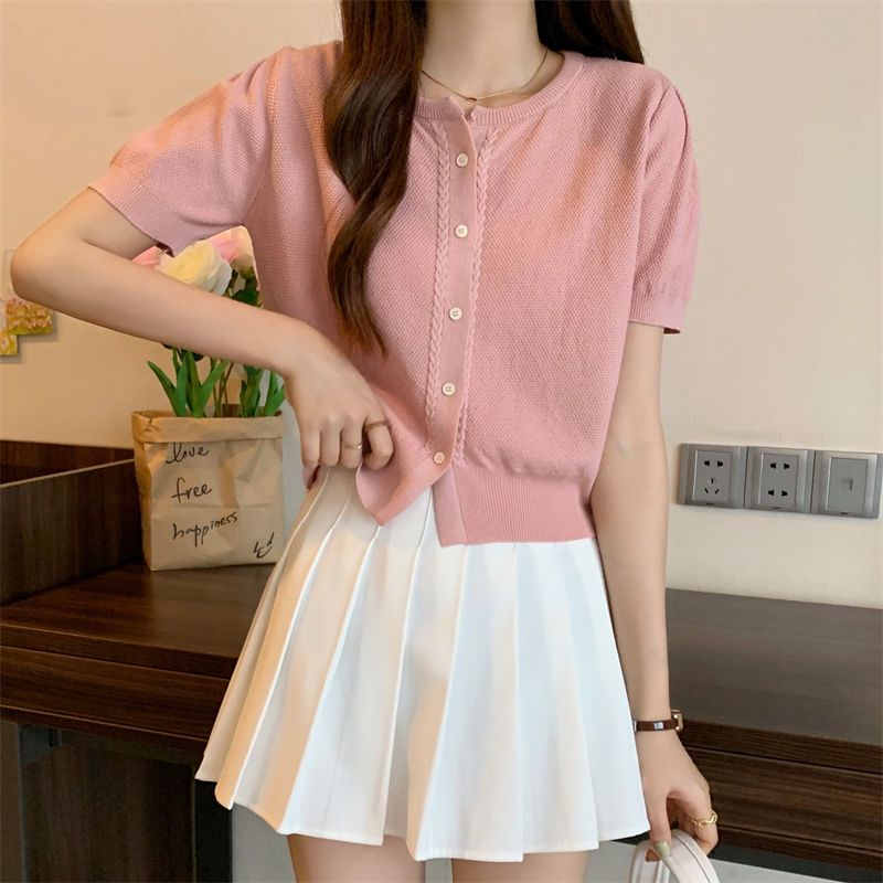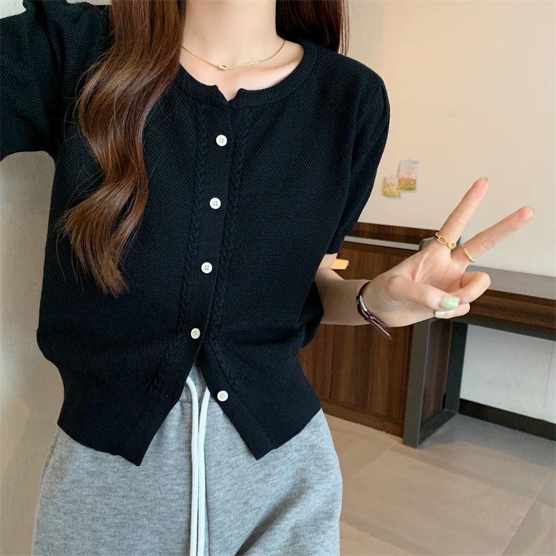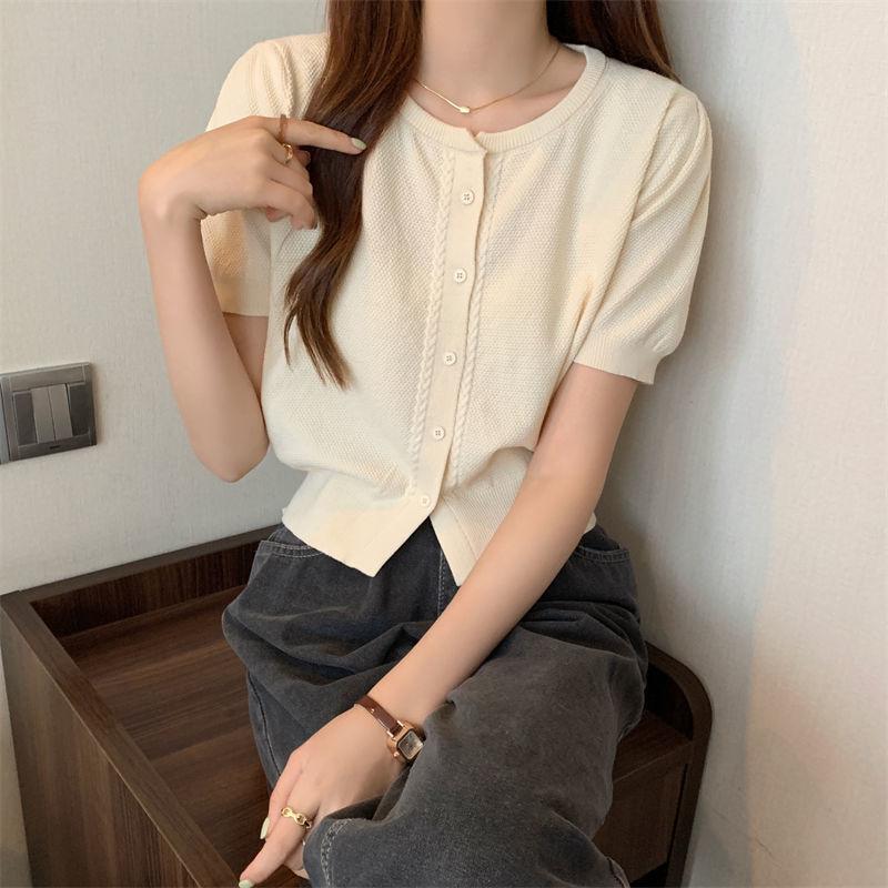 Круглый вырез однобортный вязаный свитер с короткими рукавами для женщин, летний корейский вариант, приталенный кардиган, женская футболка Niche Chic