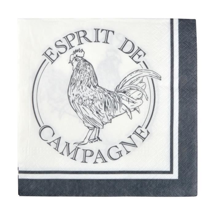 Serviettes en papier - Esprit de campagne - Lot de 20 - 33 x 33 cm - Blanc et noir