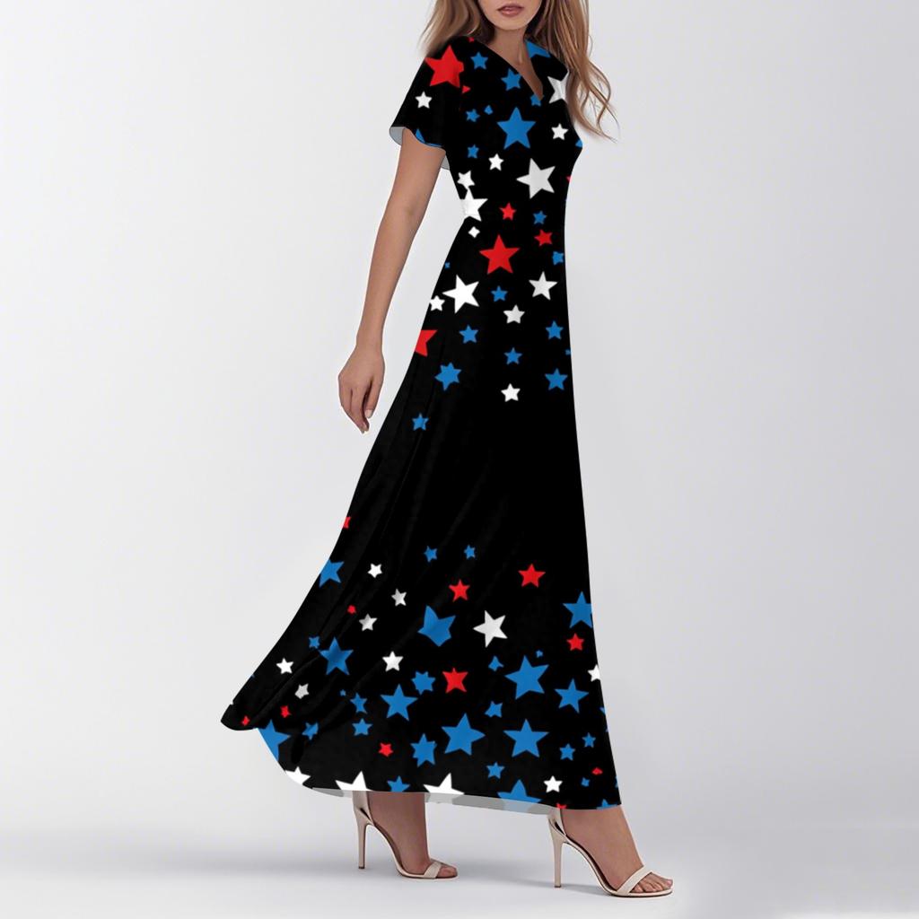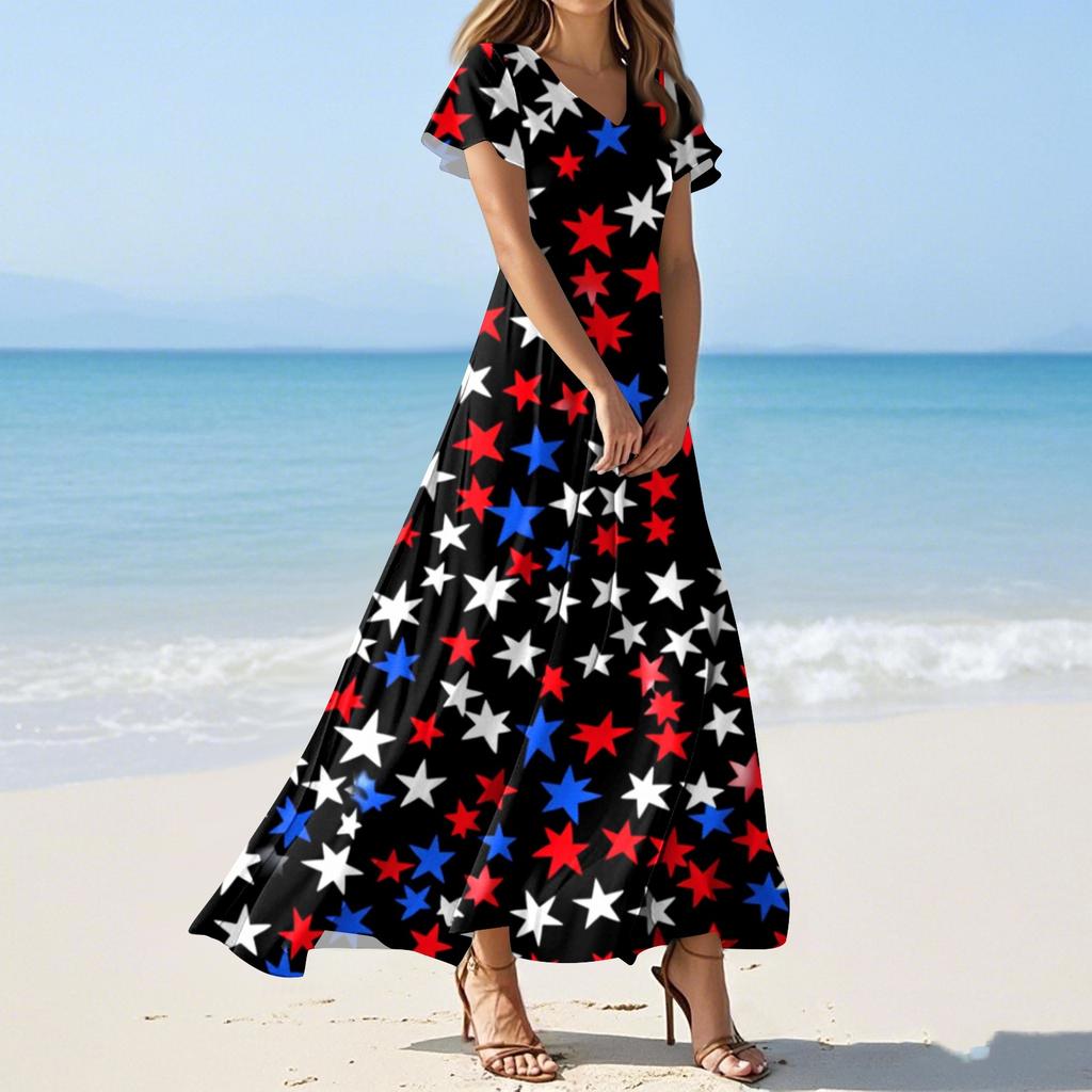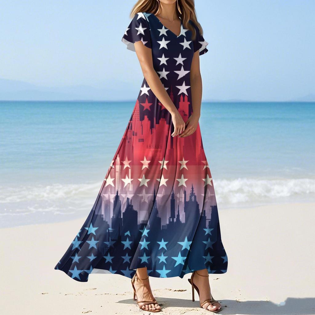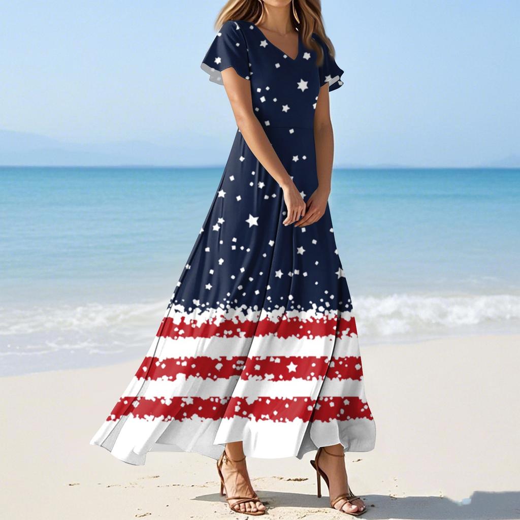 Женские летние повседневные модные платья с принтом ко Дню независимости, платья с коротким рукавом и V-образным вырезом