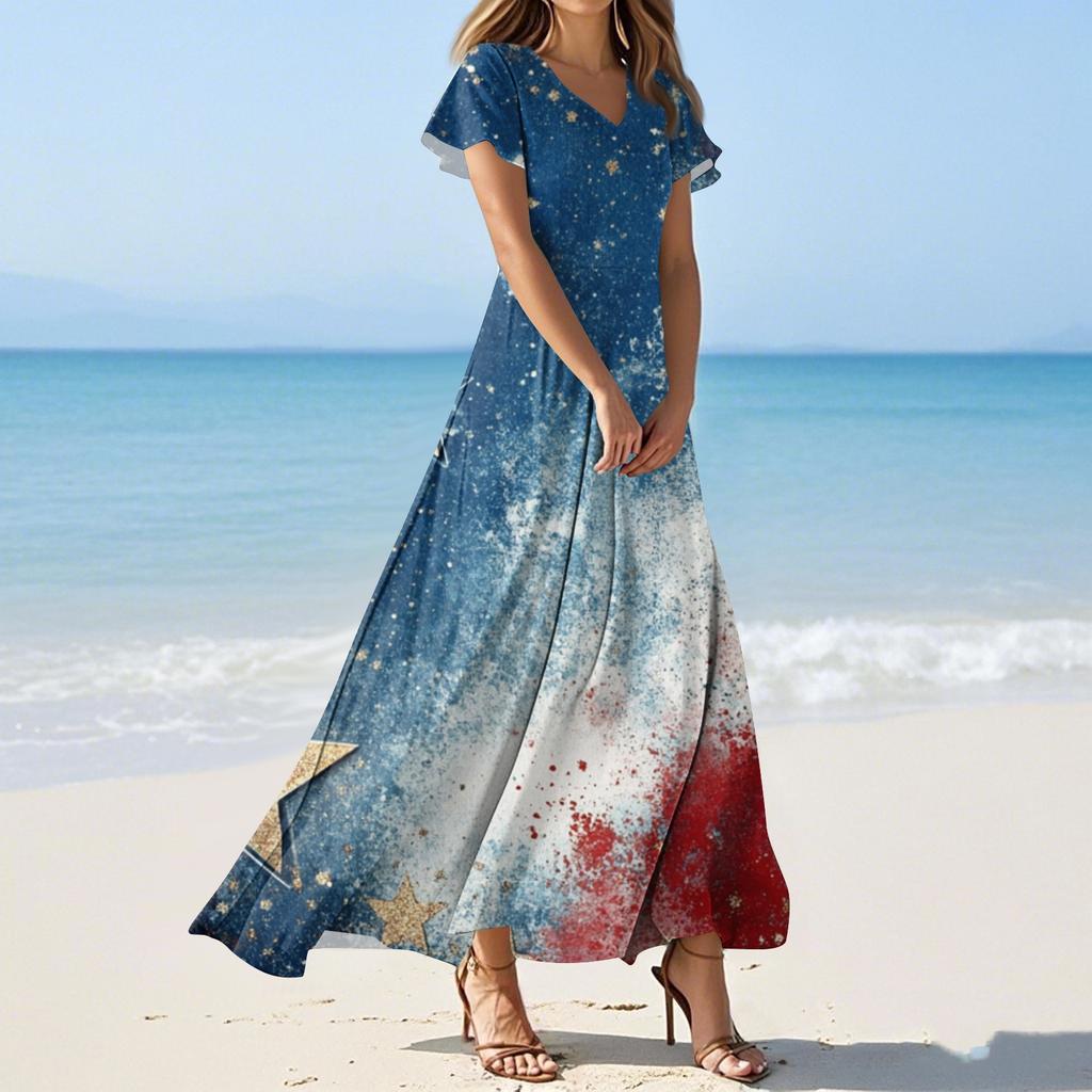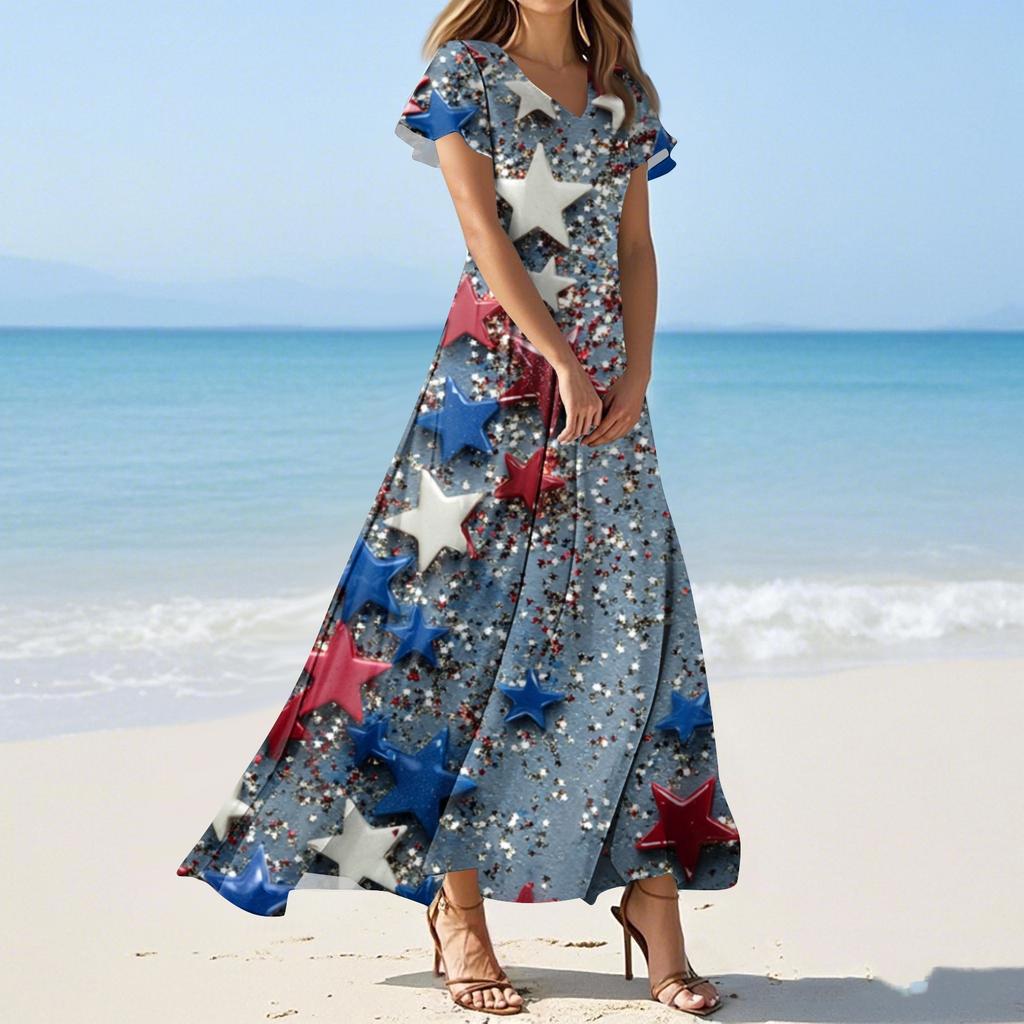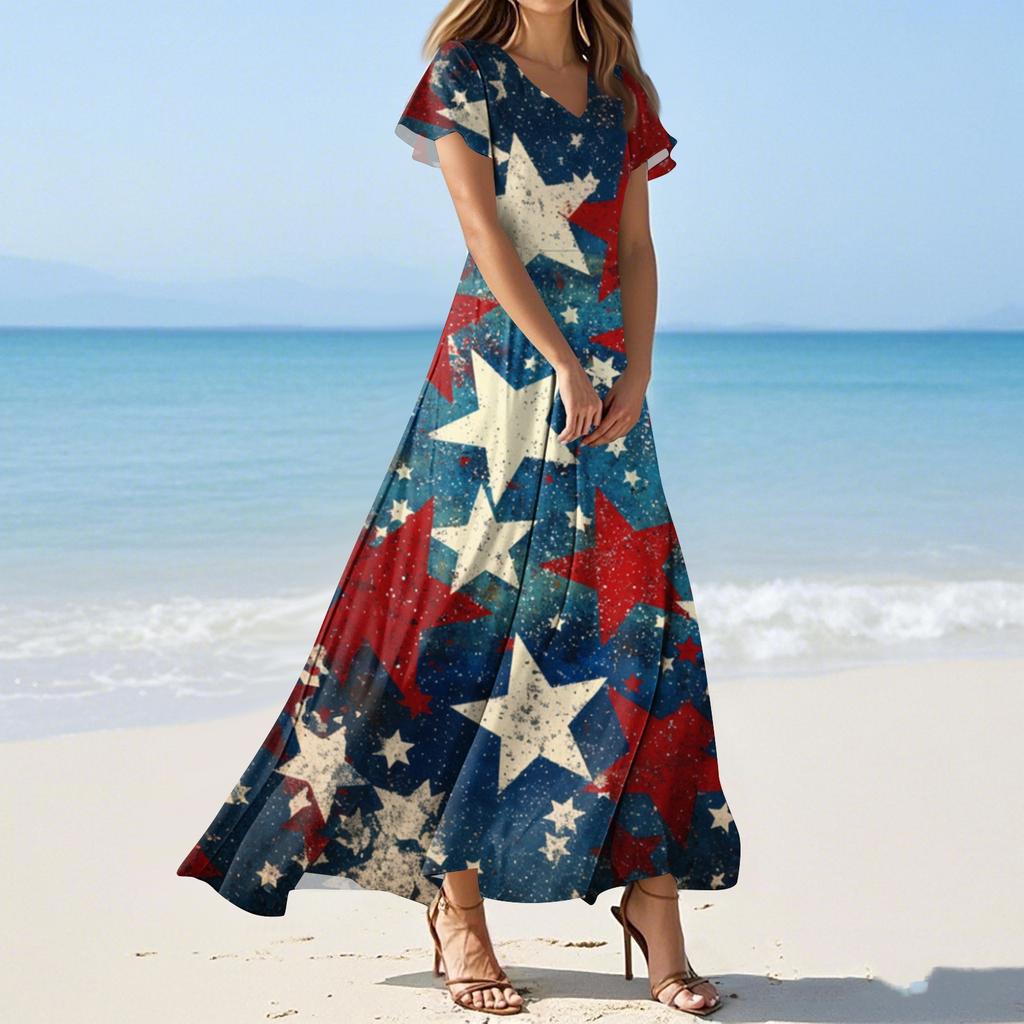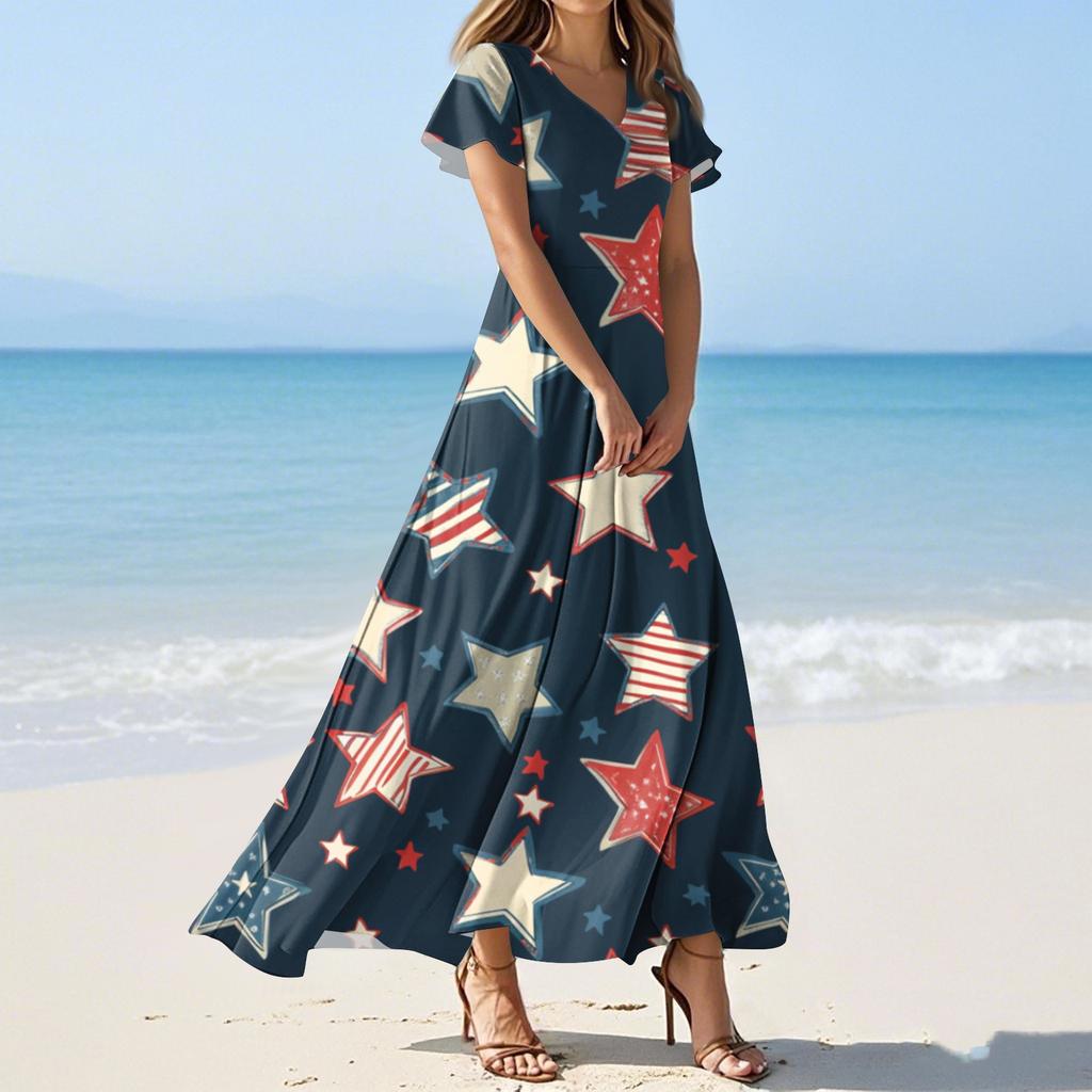 Женские летние повседневные модные платья с принтом ко Дню независимости, платья с коротким рукавом и V-образным вырезом