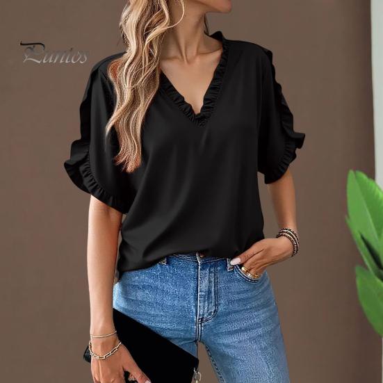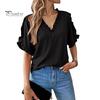 Женская рубашка с V-образным вырезом, оборками, рукавами-лепестками, однотонные топы свободного кроя, повседневная офисная дорожная рубашка