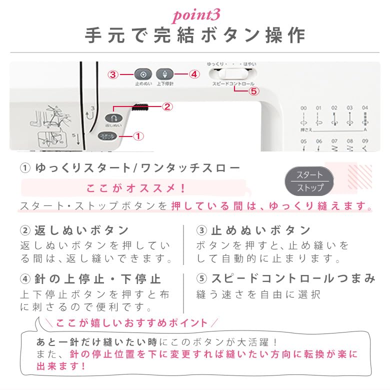 👍[Пункт 3: Полное управление кнопками под рукой] ① Медленный старт/медленное нажатие одной кнопки: Вы можете шить медленно, нажимая кнопку «старт/стоп».. ② Кнопка обратного хода стежка: Обратный стежок можно выполнять, пока нажата кнопка обратного стежка.. ③Пуговица с завязкой: Нажмите кнопку, чтобы начать шитье и автоматически остановиться.. ④ Верхний/нижний упор иглы: Нажатие кнопки верхнего/нижнего упора позволяет игле войти в ткань, что удобно. ⑤Ручка регулировки скорости: Свободный выбор скорости шитья