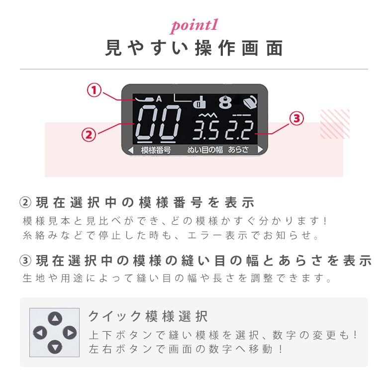 👍 [Пункт 1: Легко читаемый экран управления] Отображает номер текущего выбранного шаблона: Вы можете сравнить его с образцом узора и сразу понять, какой это узор! Если машина остановится из-за запутывания нити и т.п., вы получите сообщение об ошибке.. Отображает ширину и шероховатость шва выбранного в данный момент узора.: Ширину и длину шва можно регулировать в зависимости от ткани и цели.