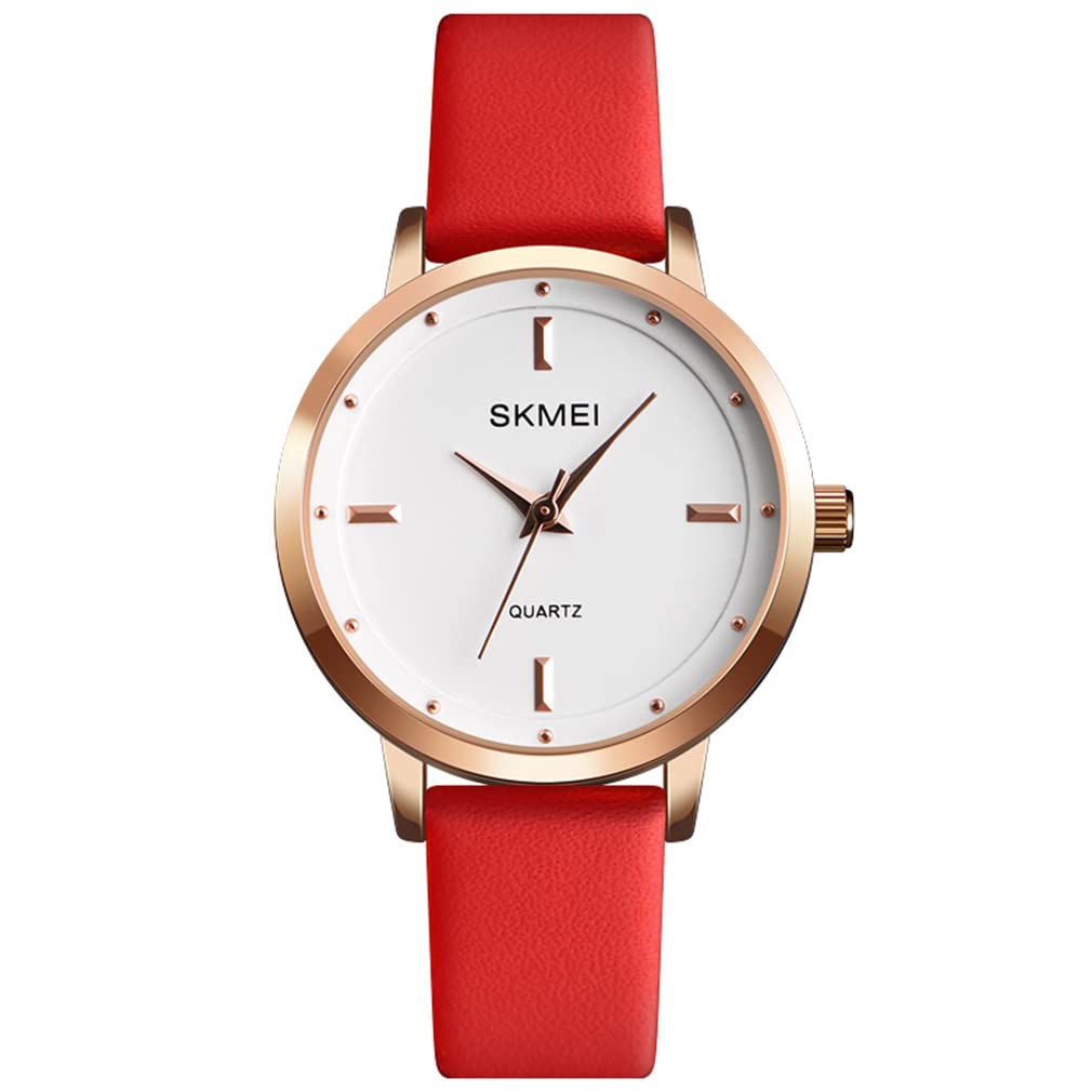 Женские часы SKMEI, стильные, маленькие, кварцевые, аналоговые, простые: Симпатичные наручные женские часы на каждый день, модный блестящий круглый корпус с фаской, ремешок из натуральной кожи с застежкой-пряжкой, привлекательны и превосходны, поскольку они тщательно спроектированы, чтобы выдержать испытание временем.
