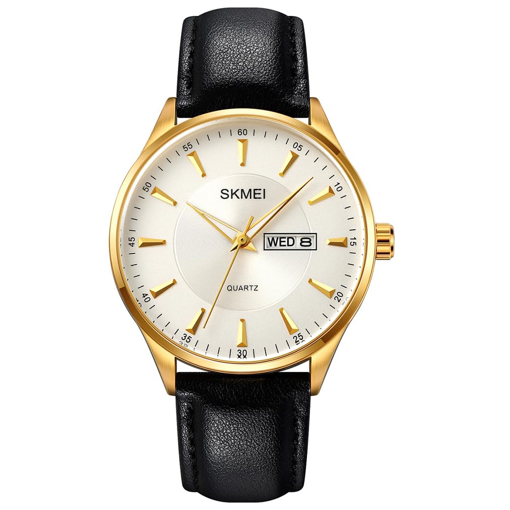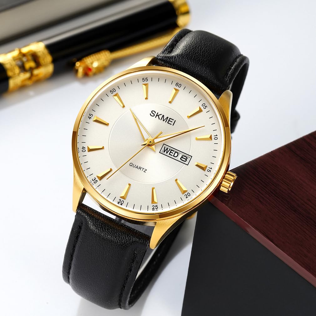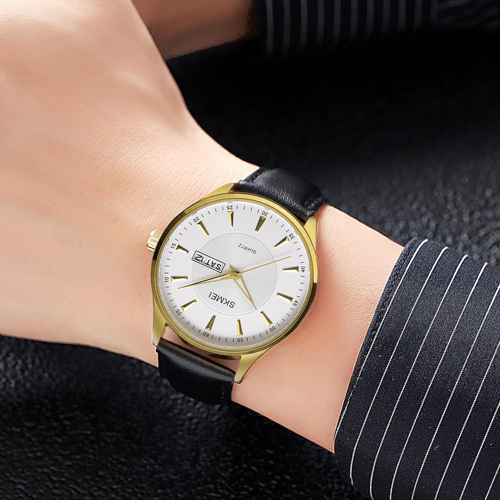 SKMEI Мужские часы Черный кожаный ремешок Стильные простые деловые классические повседневные дешевые популярные: Поскольку это недорогие роскошные часы, они получили высокую оценку и спрос среди многих покупателей.. Роскошные мужские часы отправляются компанией Amazon в кратчайшие сроки и полностью доставляются по указанному клиентом адресу.. Мужские часы, кожаный ремешок, модные, тонкие, легкие часы: Использует кварцевый механизм стабильного качества.. Водонепроницаемые мужские часы с черным ремешком оснащены высококачественным антибликовым прочным покрытием циферблата, предотвращающим появление царапин и поломок.. Часы мужские брендовые водонепроницаемые классические дата день дисплей: Модные повседневные кожаные часы с окошком дня недели и даты на циферблате, круглые наручные часы, водонепроницаемость до 30 метров. Он водонепроницаем и удобен для ежедневного использования, его можно использовать даже при мытье рук в дождливые дни.. уведомление: Не нажимайте никаких кнопок в воде, это не проблема.. Мужские наручные часы, мужской черный кожаный ремешок: Мужские наручные часы, стильный черный ремешок, стойкость цвета, воздухопроницаемость