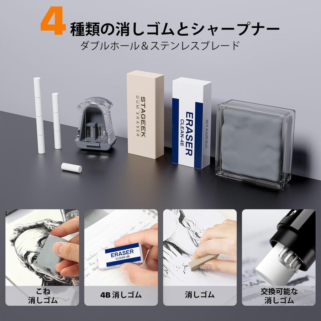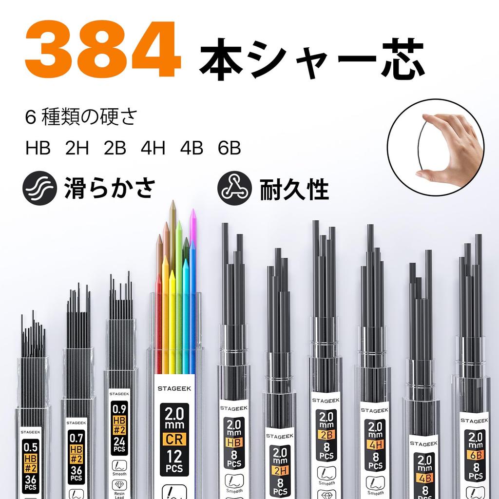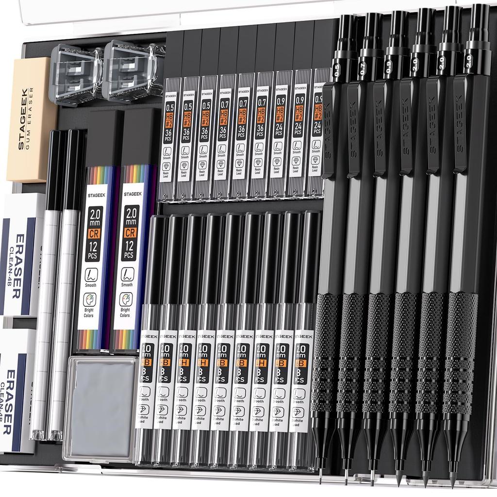 STAGEEK Набор из 6 металлических механических карандашей Art, 3 художественных чертежных карандаша (0,5, 0,7, 0,9 ММ) и 3 шт. механических карандашей для рисования (2MM) с 384 лидами (6B, 4B, 2B, HB, 2H, 4H, Цвет) для письма, черчения, рисования, черный