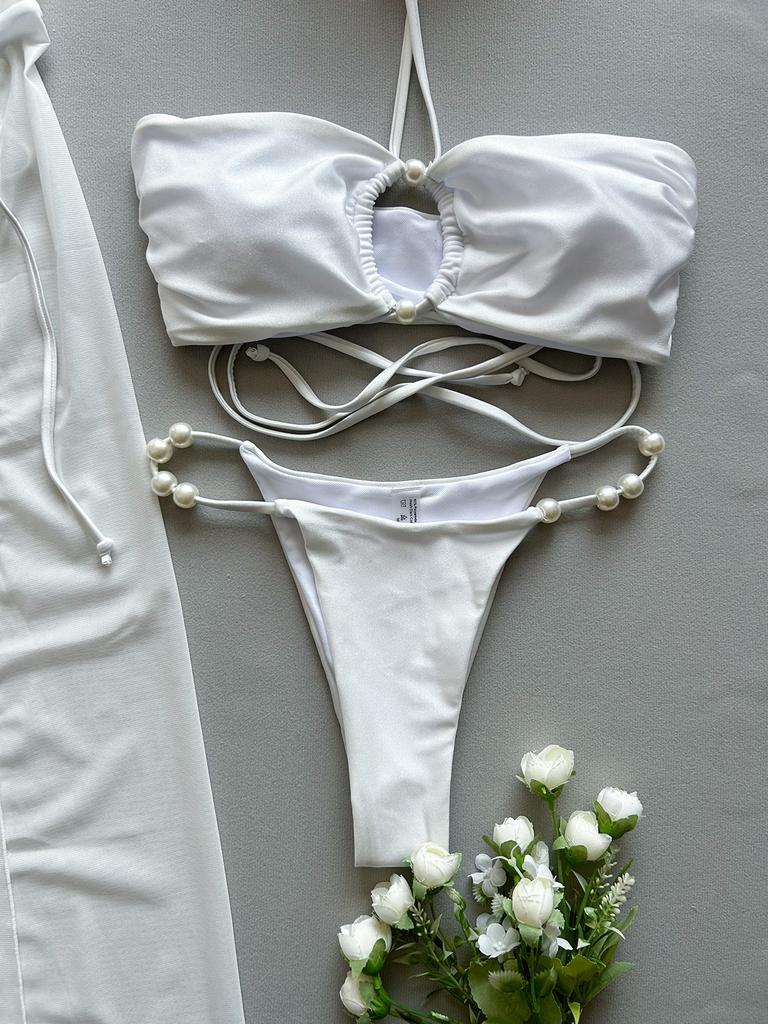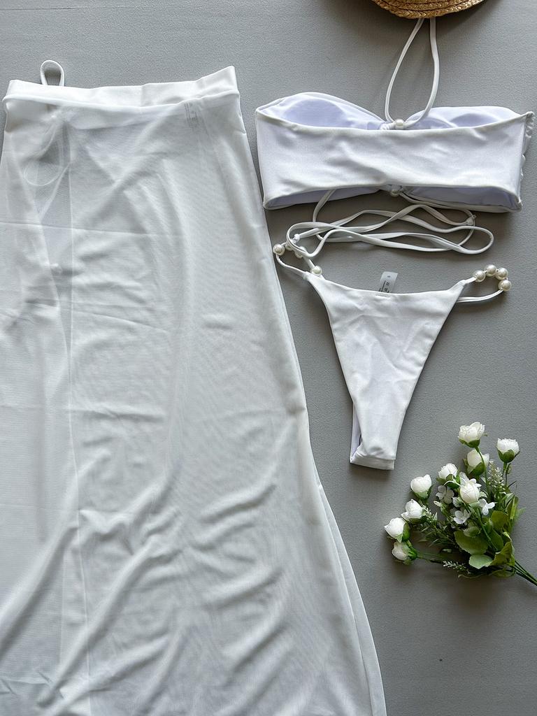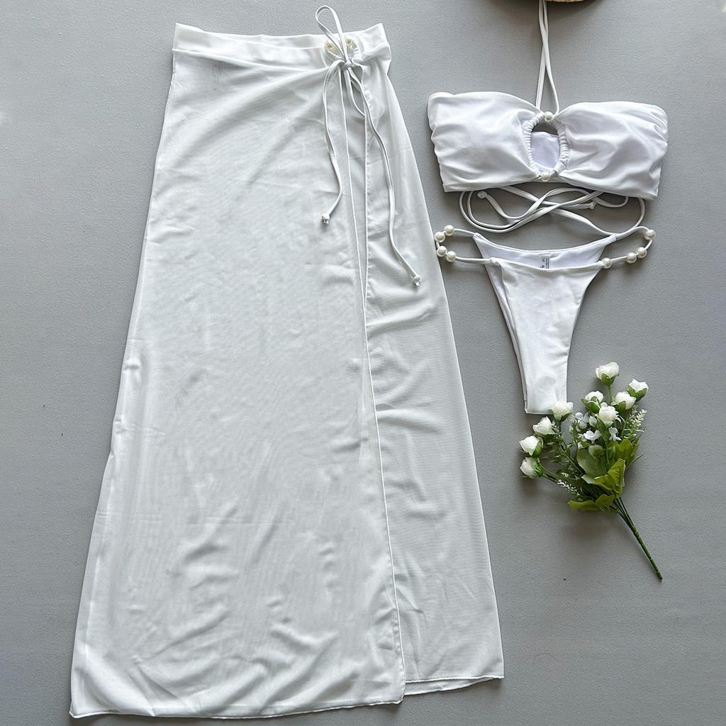 OFTBUY 2025 Новое летнее сексуальное однотонное длинное платье-костюм Элегантный жемчужный купальник для женщин из 3 предметов бикини комплект несъемный бюстгальтер простой пляжный купальник женский