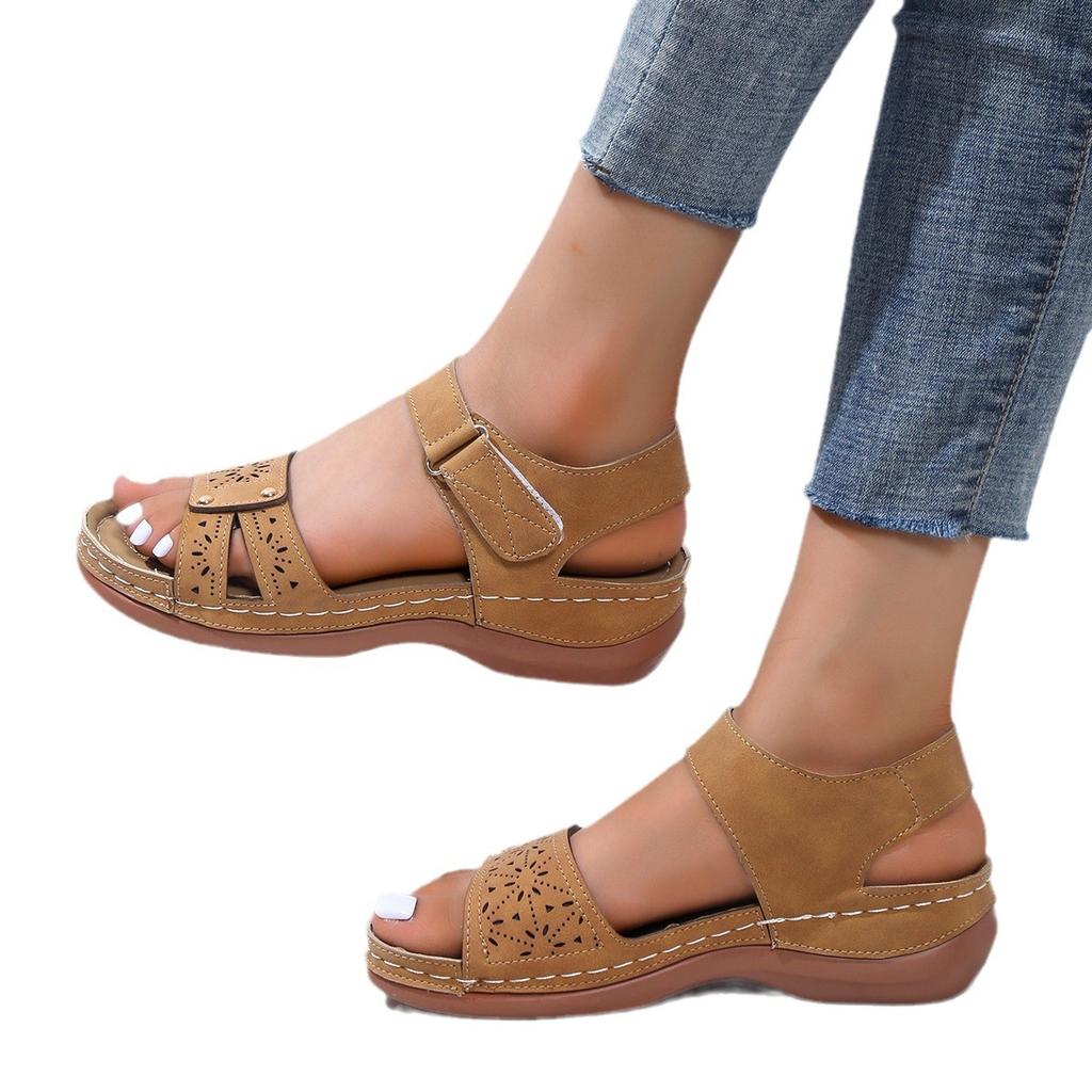 2024 импортные босоножки на танкетке большого размера женские летние новые полые толстые подошвы однословная пряжка с липучкой сандалии женские модели