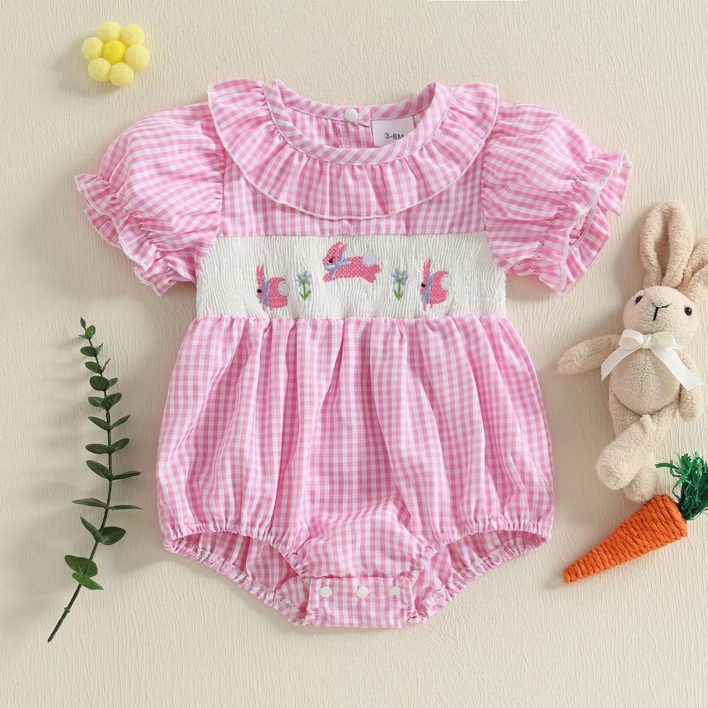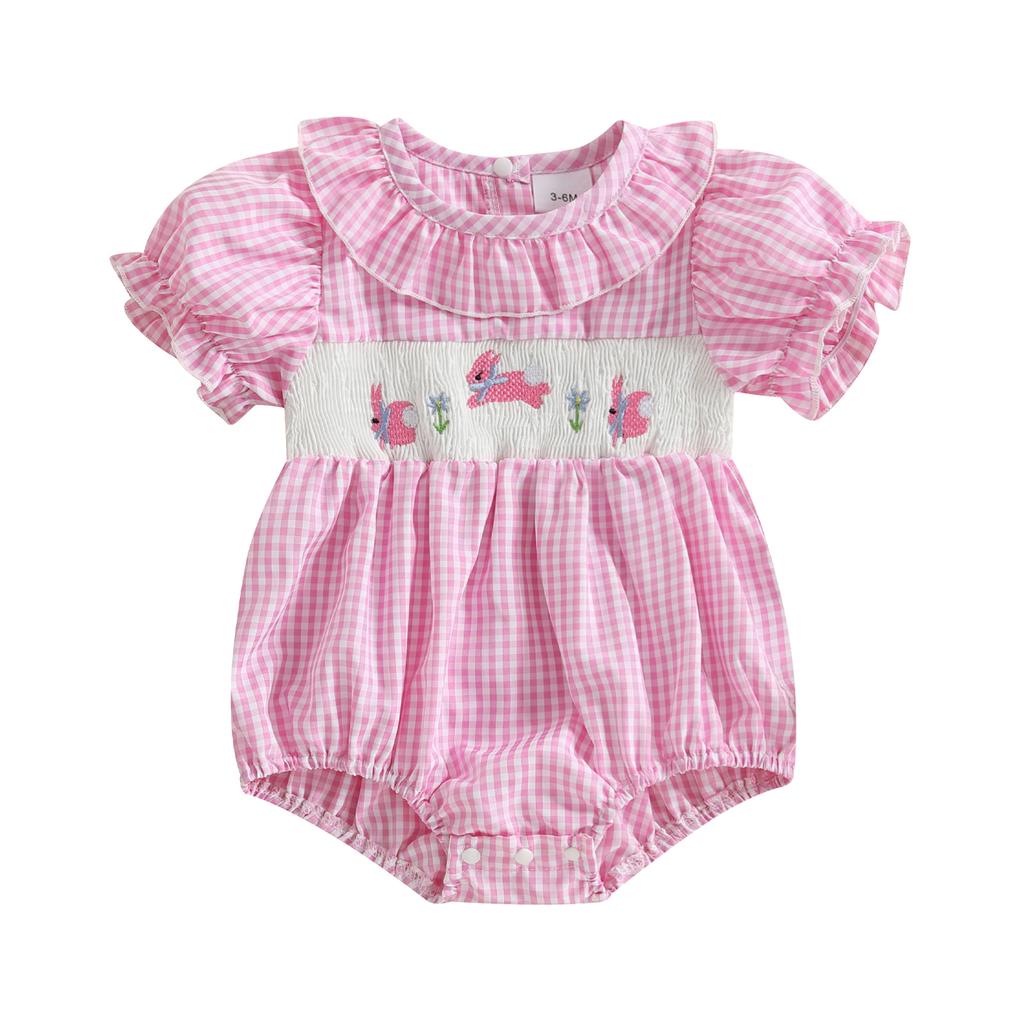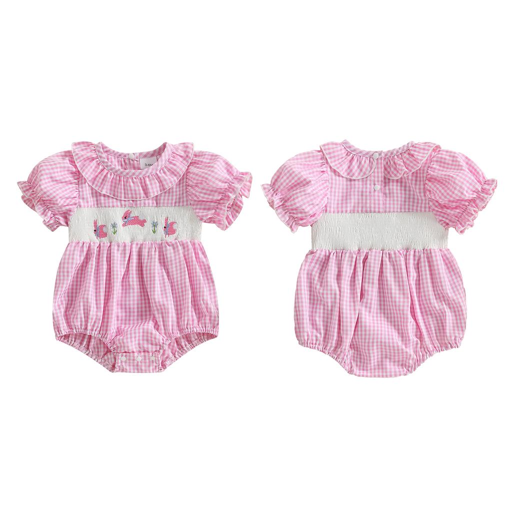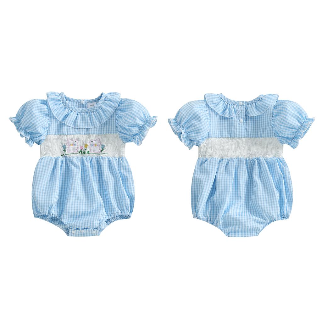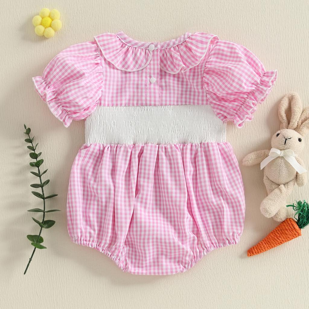 Милый клетчатый комбинезон для девочки с коротким рукавом и вышитым воротником в виде кролика