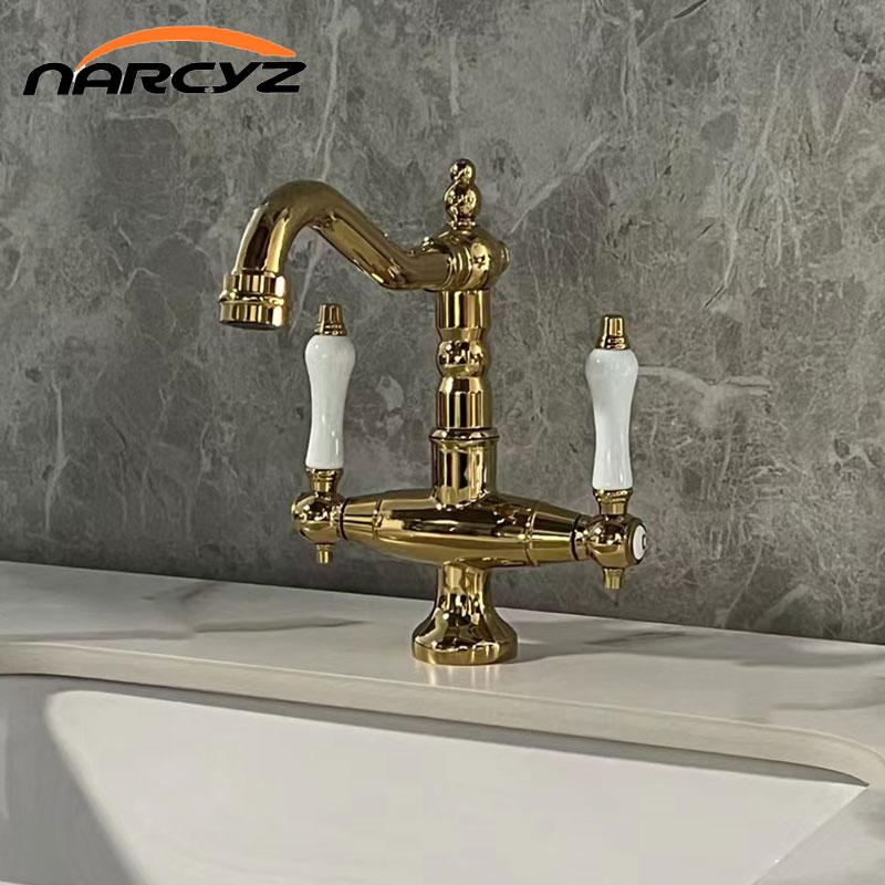 Французский винтажный смеситель Европейский золотой двухрычажный смеситель для раковины в ванной комнате керамический смеситель для горячей и холодной воды на одно отверстие 66035