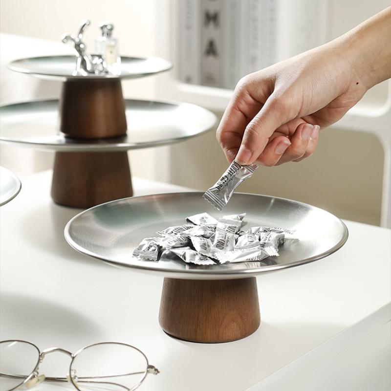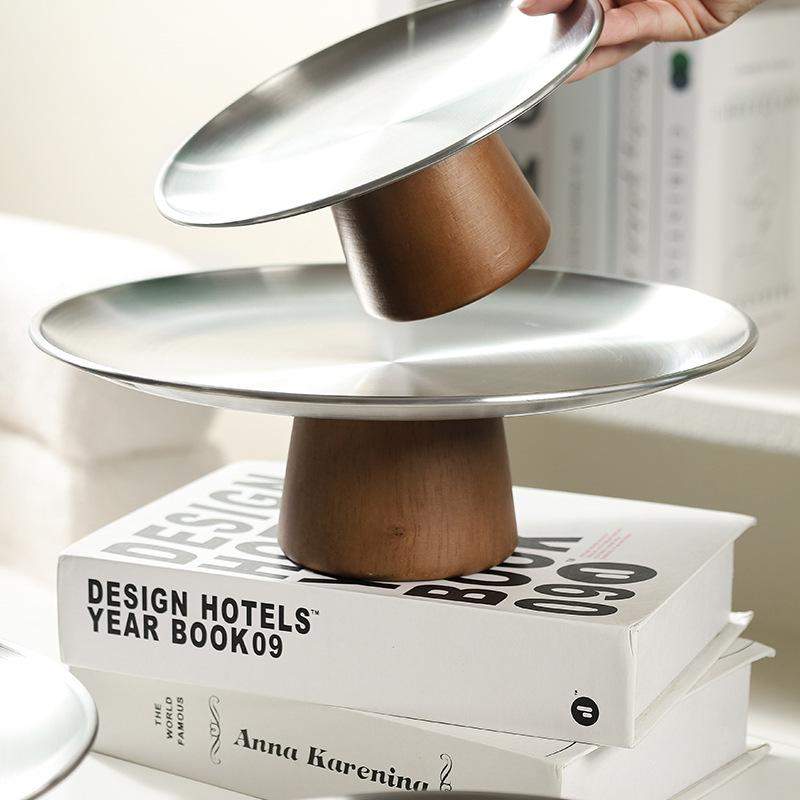 Поднос для торта из нержавеющей стали с деревянным основанием, фруктовая десертная тарелка, тарелки для хранения закусок и конфет, украшение для дома, украшение для обеденного стола