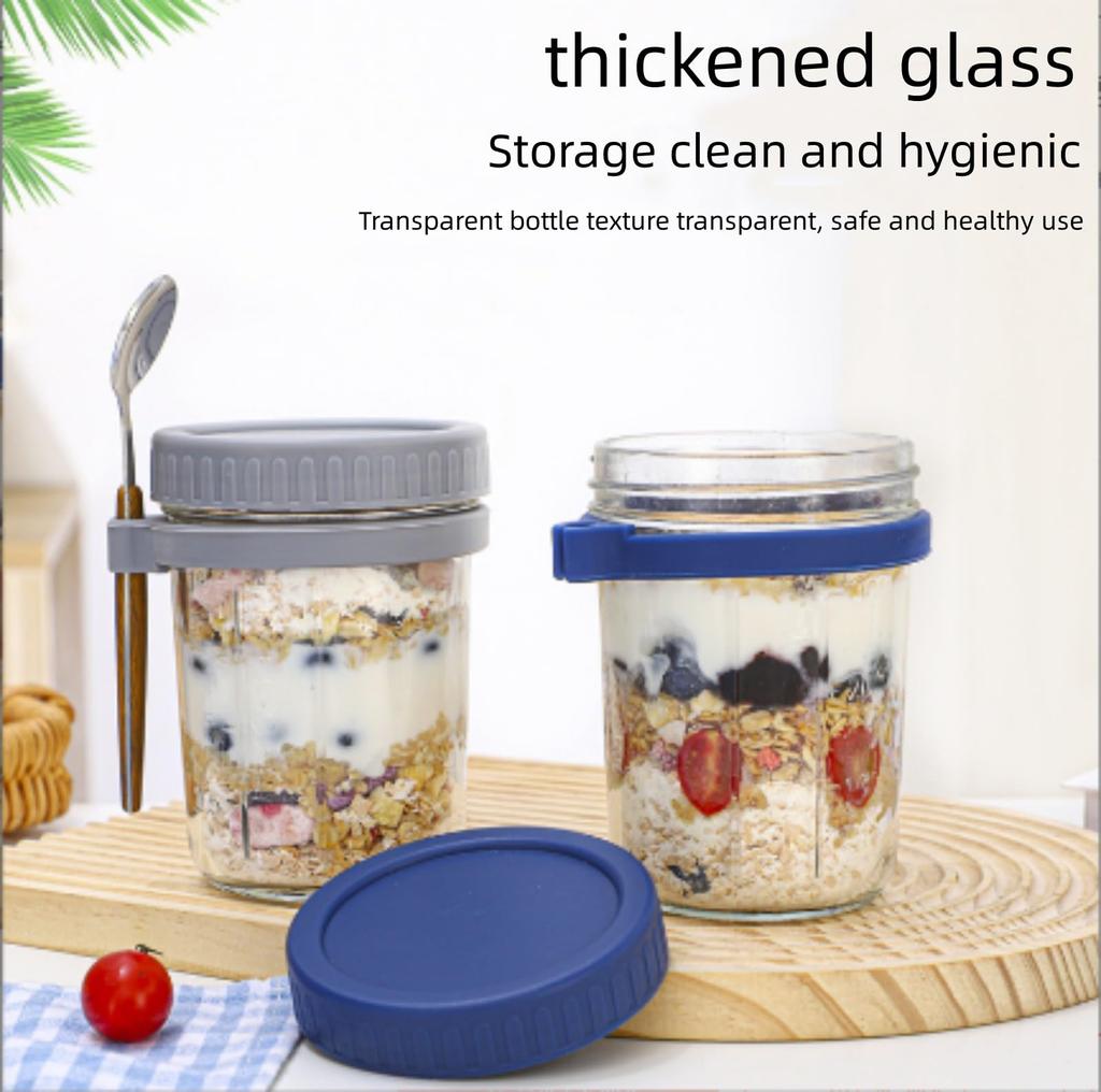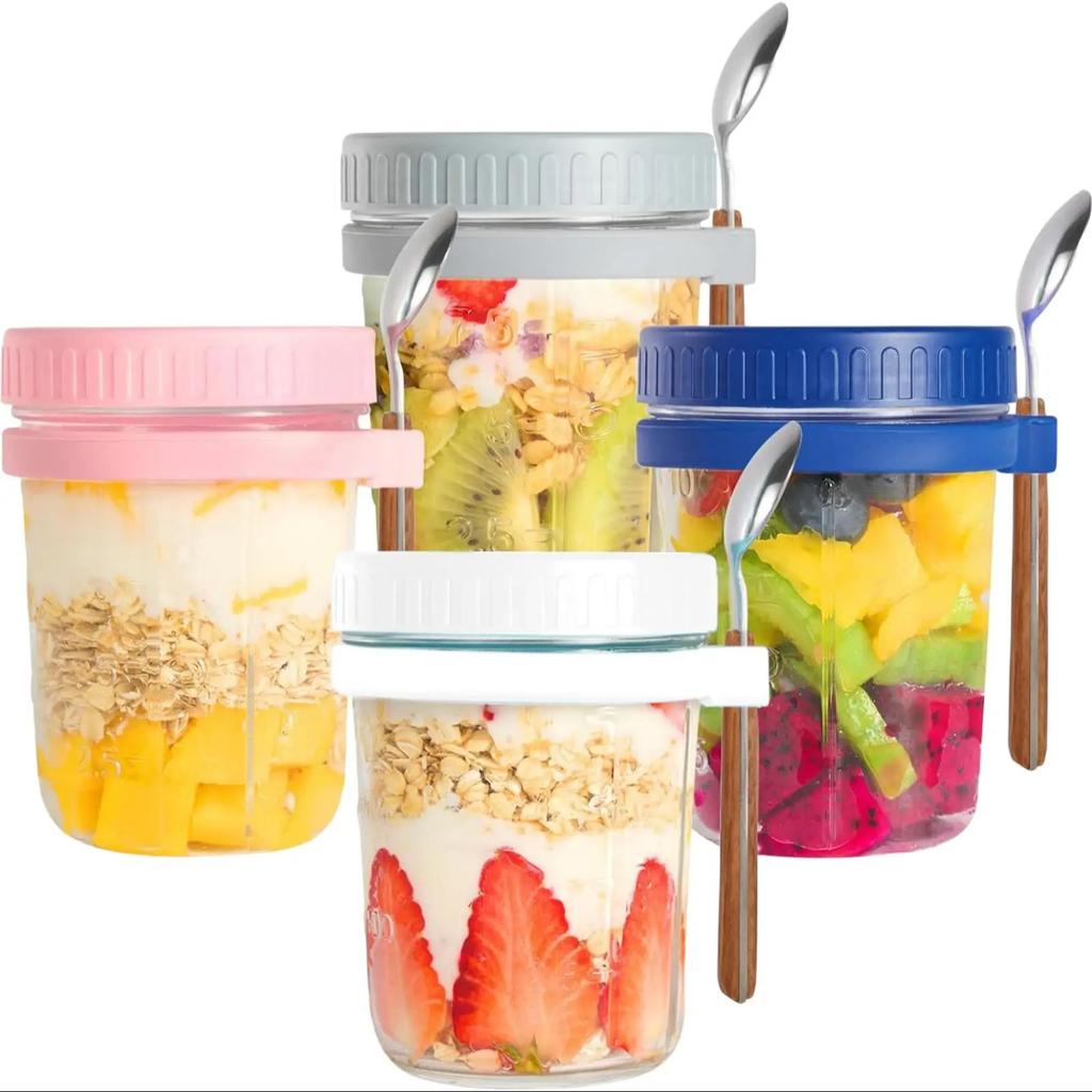 4 банки Мейсона для ночной овсянки - стеклянные контейнеры для хранения продуктов с крышками и ложками - 16 унций, разноцветные банки с отметками