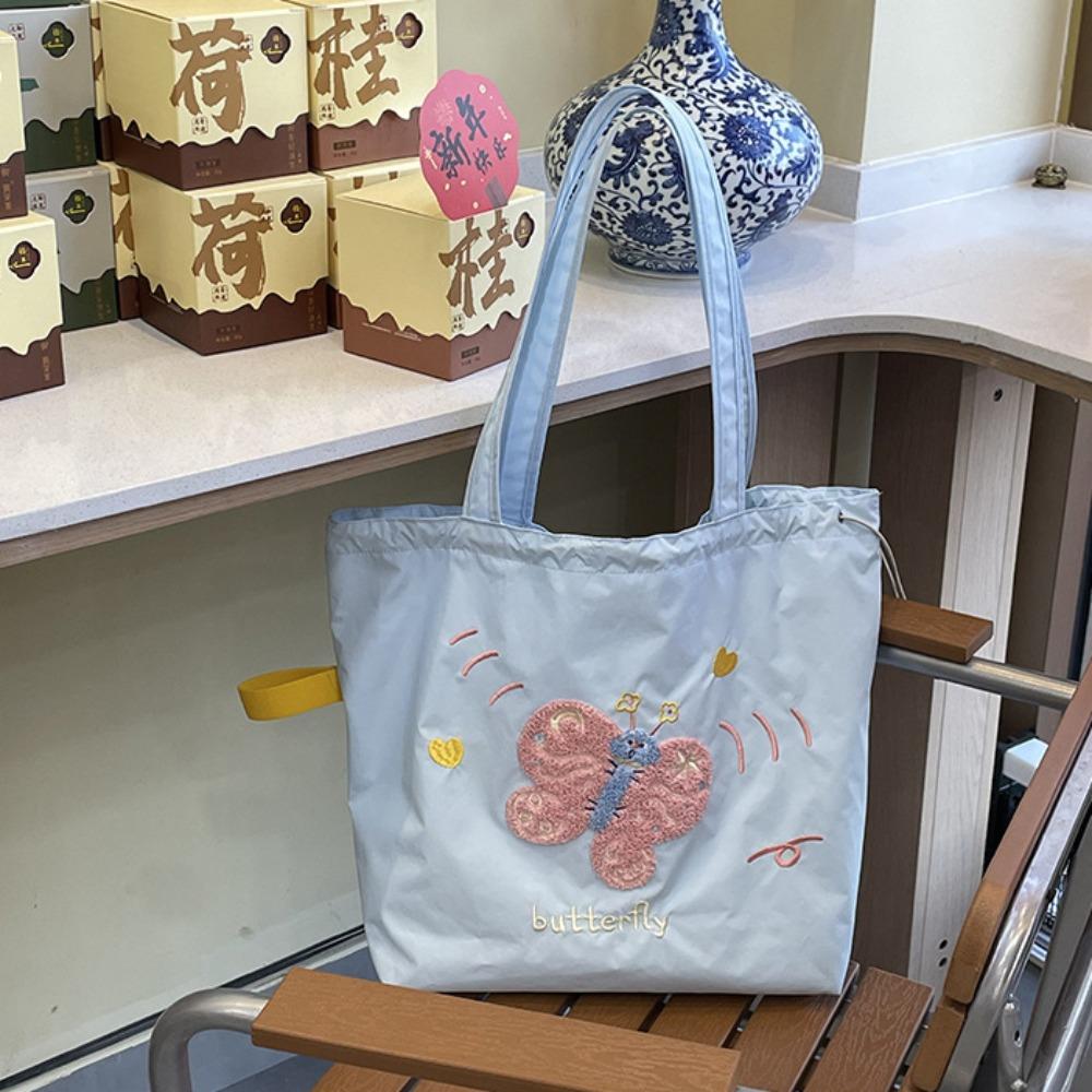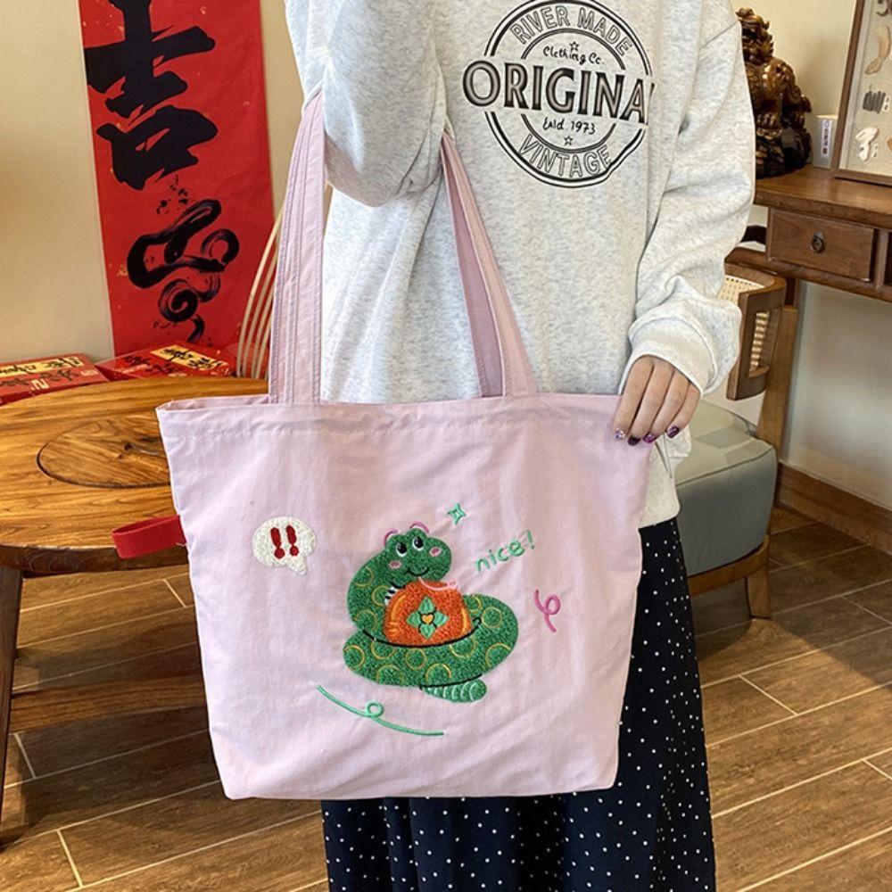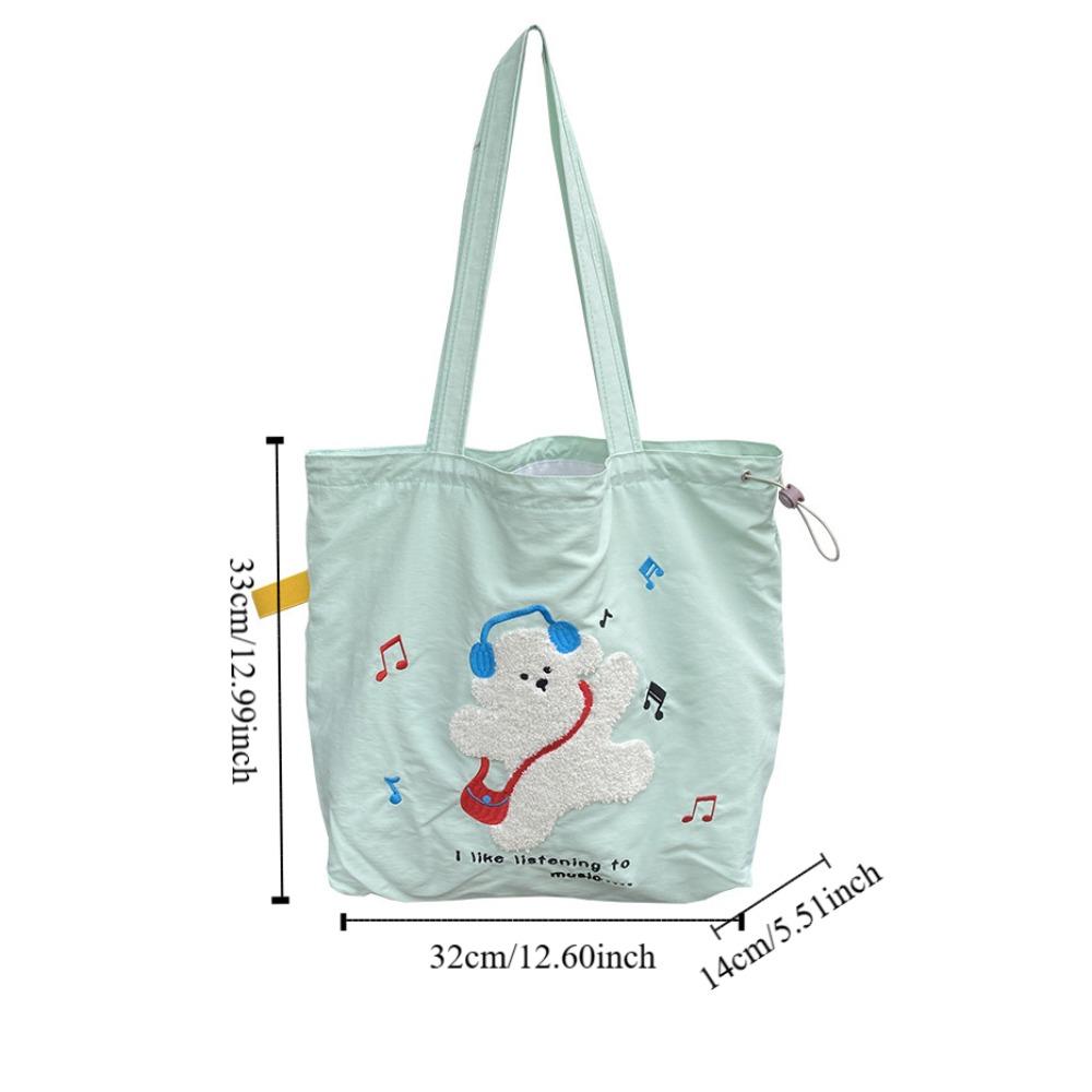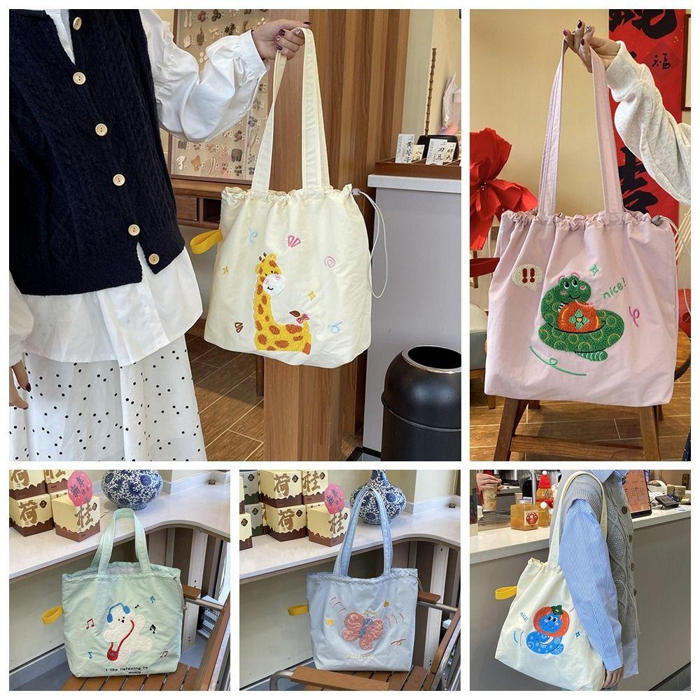 Animal Pattern Embroidery Shoulder Bag Kawaii Cartoon Canvas Bag Drawstring Tote Bag Women