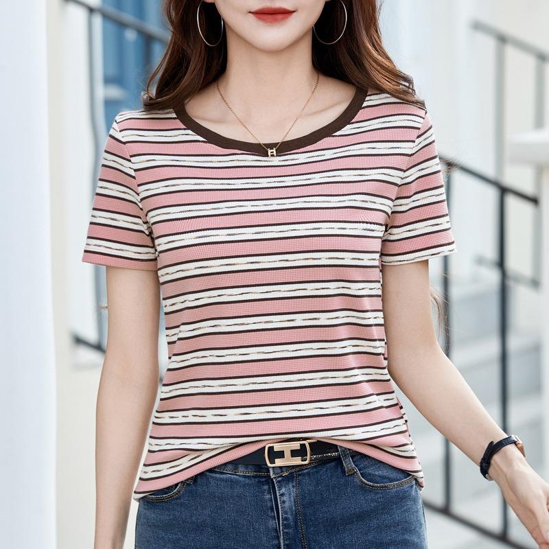 Женская полосатая футболка с короткими рукавами, весна-лето, снаружи, новая трикотажная рубашка с круглым вырезом, нижняя часть, внутренняя часть плеча, тонкий топ