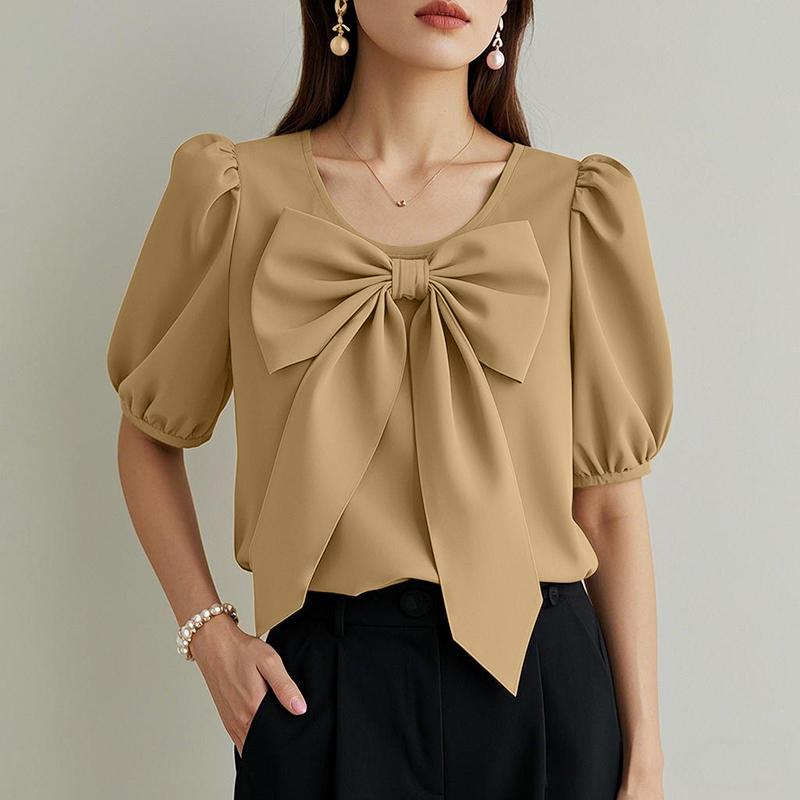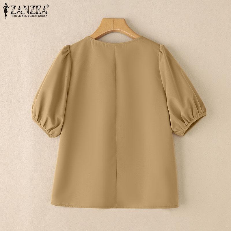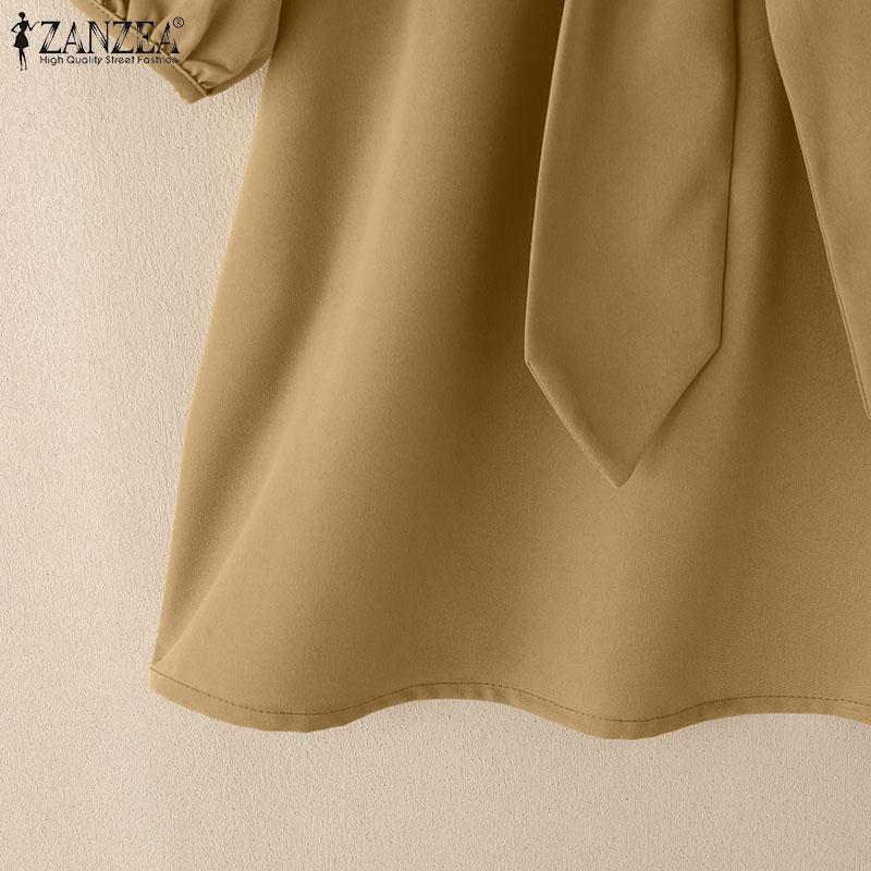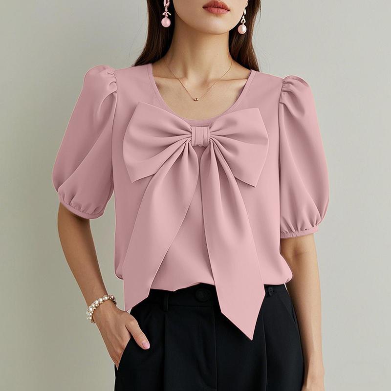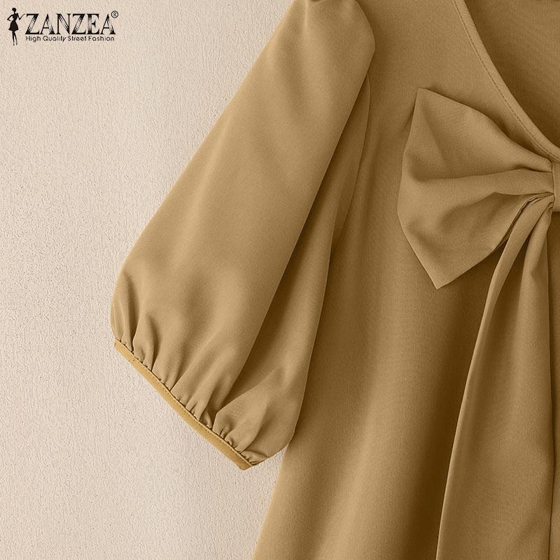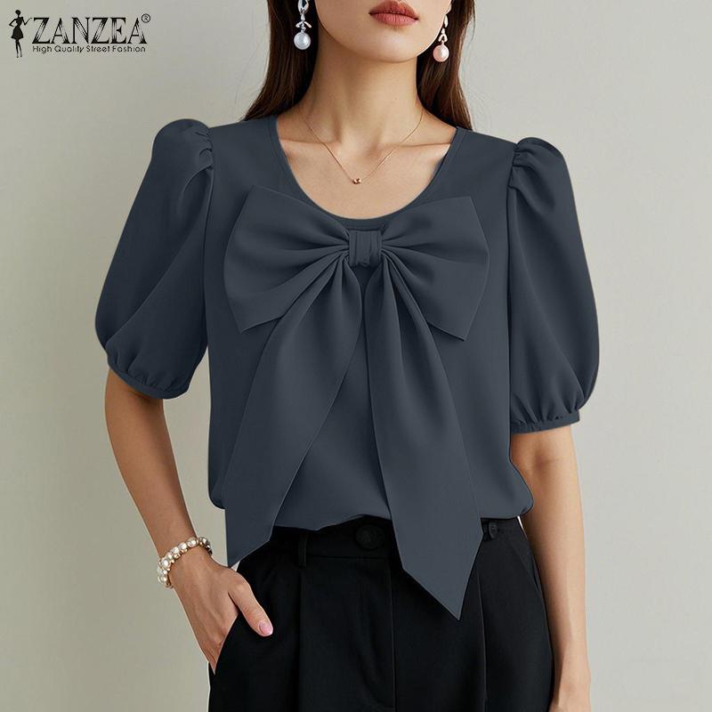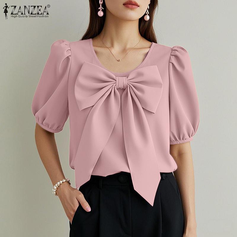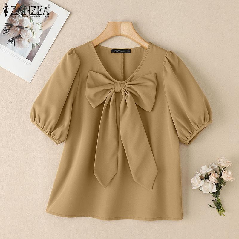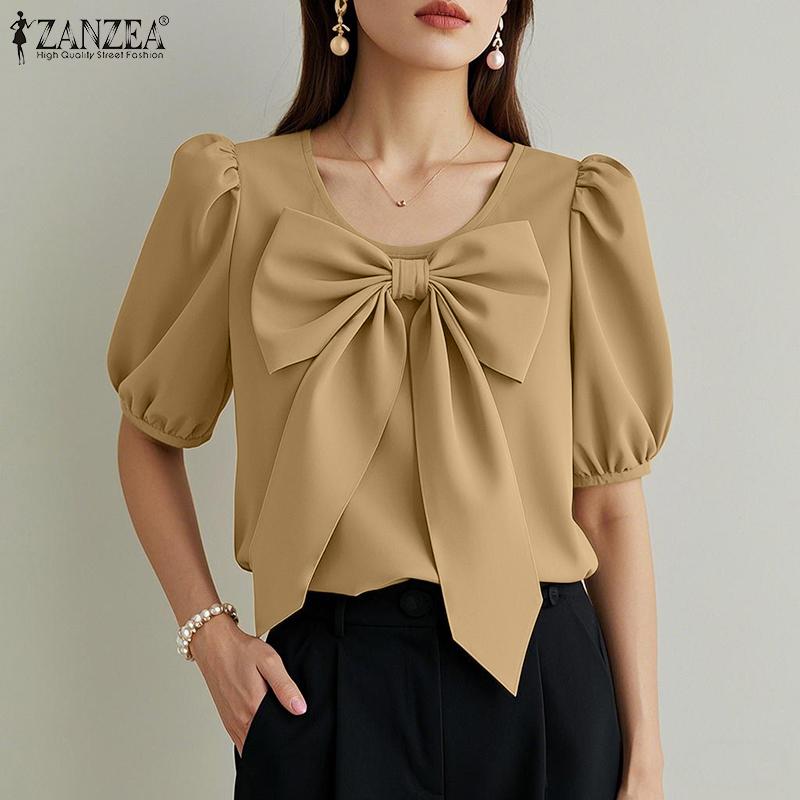 ZANZEA Женская повседневная блузка с круглым вырезом и коротким рукавом в стиле пэчворк с бантами