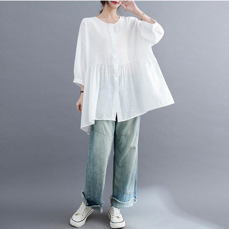 Johnature Летние свободные простые женские корейские рубашки повседневные однотонные рукава три четверти тонкие блузки топы