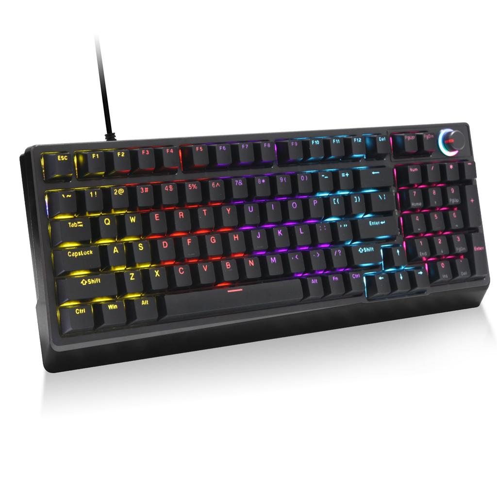 【Ультракомпактная раскладка】Механическая клавиатура имеет 98 клавиш, максимально экономя место на клавиатуре, при этом сохраняя необходимые вам буквы, цифры и функциональные клавиши. Раскладка оснащена поворотными ручками, которые можно поворачивать влево или вправо для регулировки громкости или нажимать для отключения звука, что позволяет пользователям легко выполнять задачи в различных сценариях.